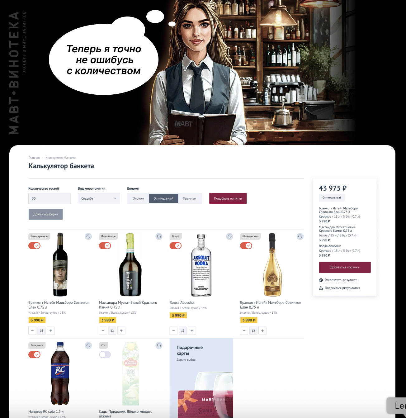 Это уже вторая версия калькулятор банкета, которая ожидает релиза. Первично калькулятор на сайте присутствовал в виде: ввели количество гостей, какие напитки ожидаются и выдавал результат. Было непонятно, что происходит в дальнейшем с этими посетителями. Хотя страница пользуется спросом, каждый день людя проводят калькуляции.