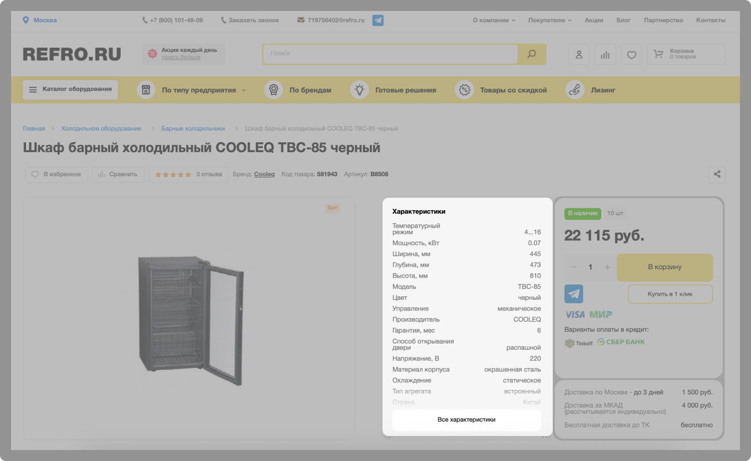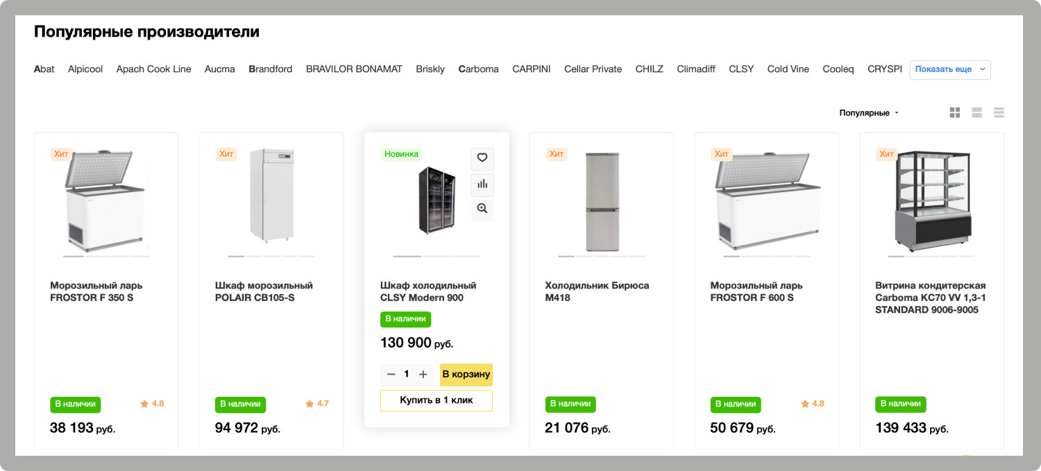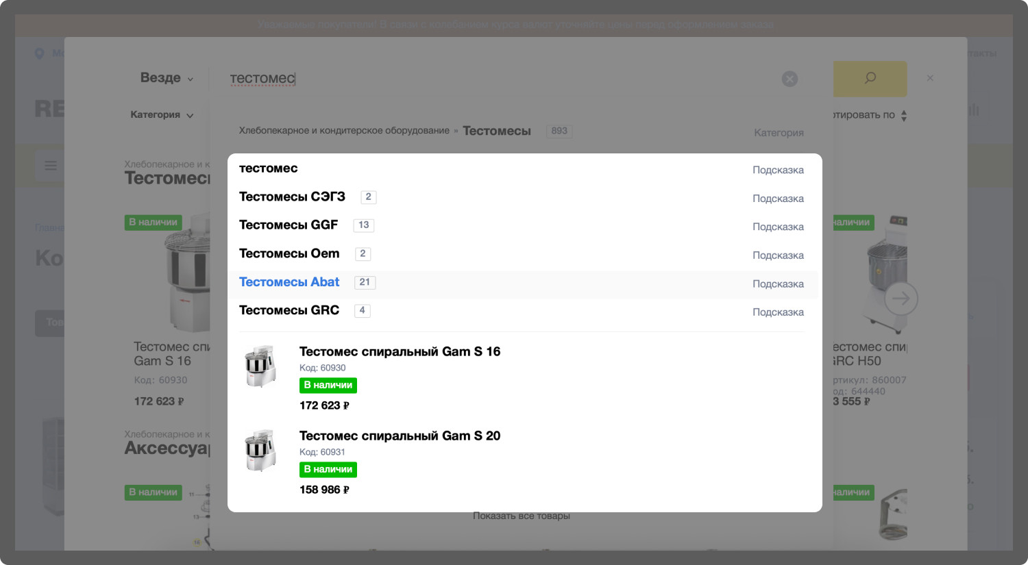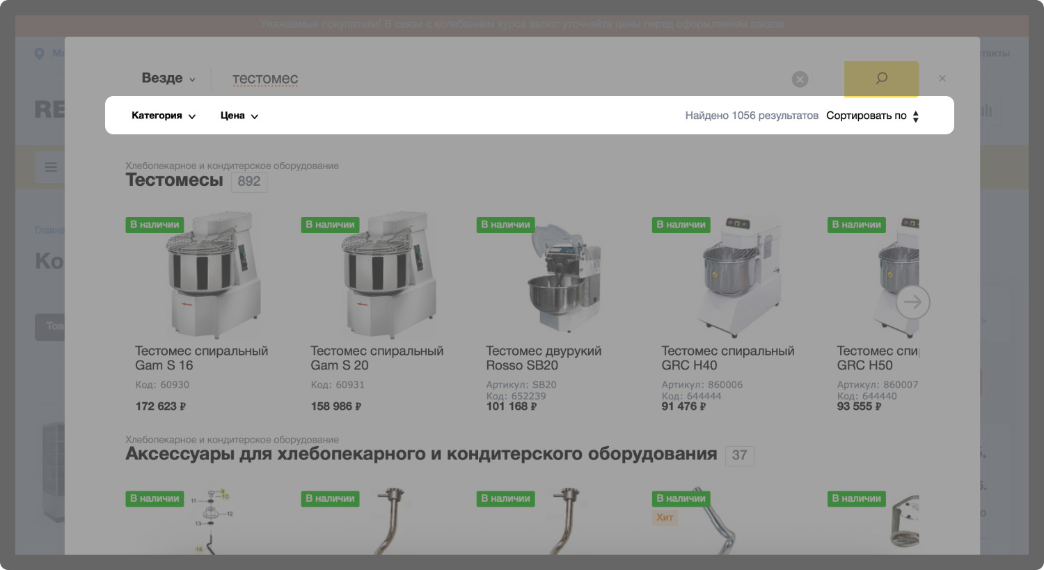 Для проекта с большим ассортиментом ключевым элементом стал поиск. На сайте клиентом был установлен более информативный поиск от платного сервиса. Такой поиск позволял сразу отсортировать товары по категориям, ценам и релевантности. Это позволяло покупателям более быстро и точно найти требуемый товар. Сделали вывод подсказок с похожими товарами, чтобы покупателям было легче ориентироваться в товарах: Данные доработки позволили пользователям быстрее находить нужное оборудование и не теряться в каталоге Главная страница должна была сразу вести пользователя к товарам. По запросу клиента мы вывели «товар дня» на главный экран. В данном блоке отображаются товары, которые являются хитами или новинками, а также товары, которые вновь появились в наличии. Кроме того, использование такого блока позволяет привлечь дополнительное внимание к товарам, требующим рекламы На главную мы вывели категории товаров. Чтобы потенциальные покупатели могли сразу попадая на сайт, легко выбрать то, что требуется. На главную страницу вывели блок с поиском товаров по брендам, так как данный вид поиска является удобным для многих покупателей Выводили отдельно кнопку каталога, а также вывели каталог товаров, разделенный по направлениям: по типу предприятия, по брендам, товары со скидкой и прочее. Поиск товаров по типу помещения позволяет легко найти технику, которая необходима для определенной сферы бизнеса — прачечная, пончиковая и др. Так, если посетителю сайта нужны товары для пиццерии — нет необходимости в поиске каждого товара по-отдельности. Достаточно перейти в соответствующий раздел, где уже собраны все товары. В каталоге оборудования на каждый тип товара были выведены популярные категории, которые пользуются наибольшим спросом среди покупателей В каталог вывели большое количество разделов для удобного поиска необходимых товаров: Вывели блок с товарами, сгруппированными по популярным производителям: Мы произвели доработку фильтра по статусам товаров: хит, новинка Также была доработка по наличию товаров: в наличие, под заказ. Все стикеры выделили цветом для лучшей наглядности При выборе подходящего товара покупатели часто ориентируются на их основные характеристики: размер, цвет, производитель и прочее. Чтобы сократить путь пользователя от поиска товара до совершения покупки, в каталоге мы вывели все основные характеристики к каждому товару. Это позволяет легче ориентироваться в товарах и быстрее находить необходимое оборудование Прежде всего мы увеличили масштаб фото товара, сделав его более крупным и акцентным: Рядом с фото товара мы вывели блок с его основными характеристиками: Проработали конверсионный блок: вывели способы оплаты, краткую информацию о доставке, сделали более заметной стоимость товара: Вывели блок с документацией к каждому товару, что позволяет покупателям ознакомиться с сертификатами и другими документами, подтверждающими качество техники: Разделили характеристики товаров по группам (заводские данные, основные характеристики, особенности и прочее), так как на стандартном шаблоне данного функционала не хватало. Поделили блок «с этим товаром покупают» на табы: похожие, хиты продаж: Проанализировав пользовательский путь, мы приняли решение сократить его на 1 шаг. Как известно, чем он короче, тем легче по