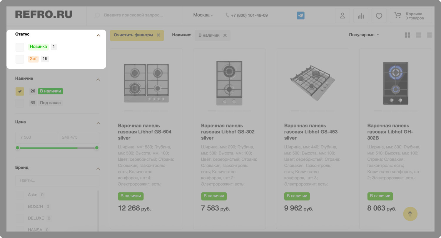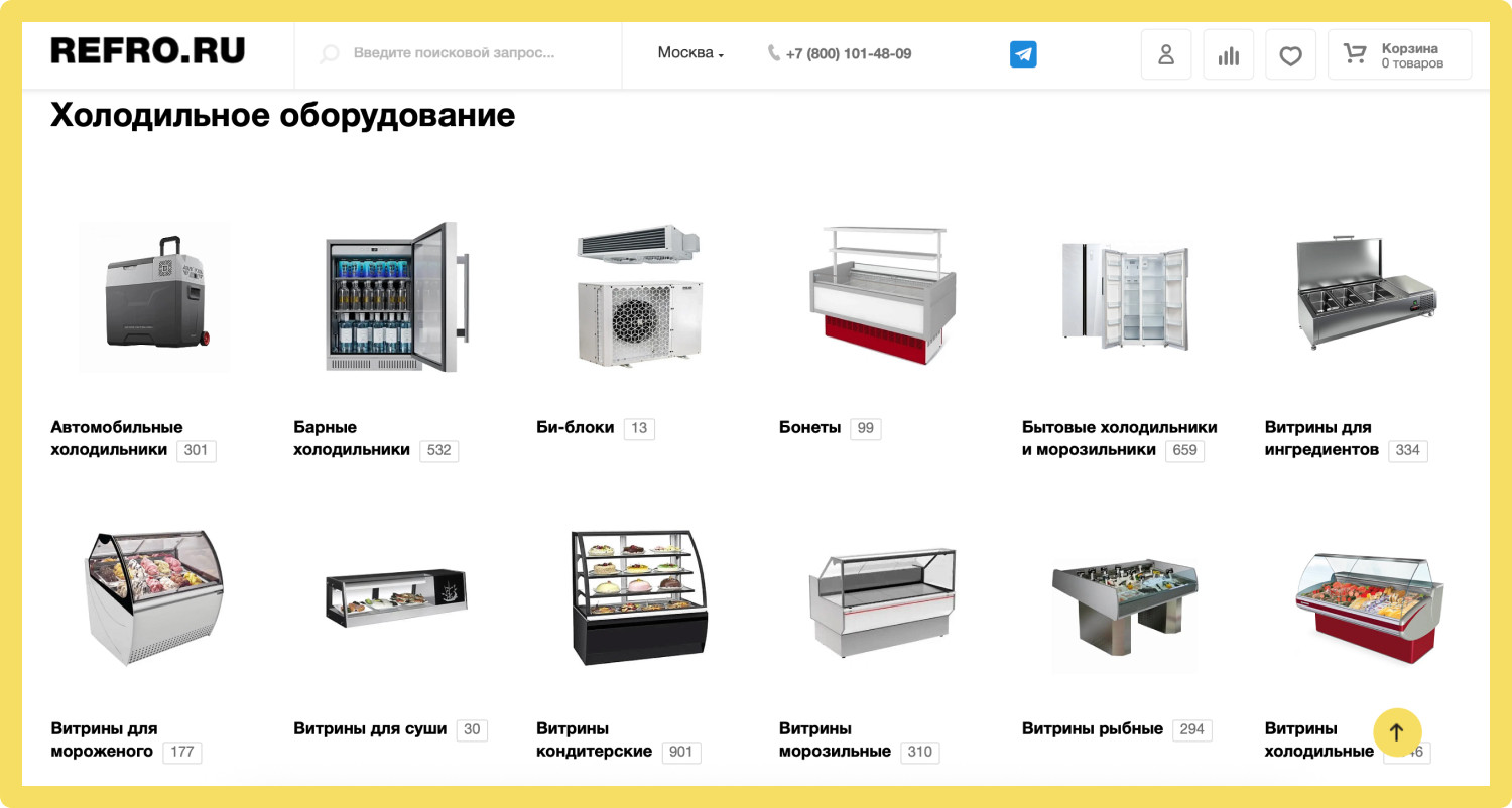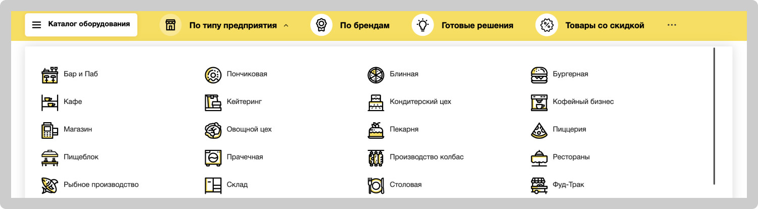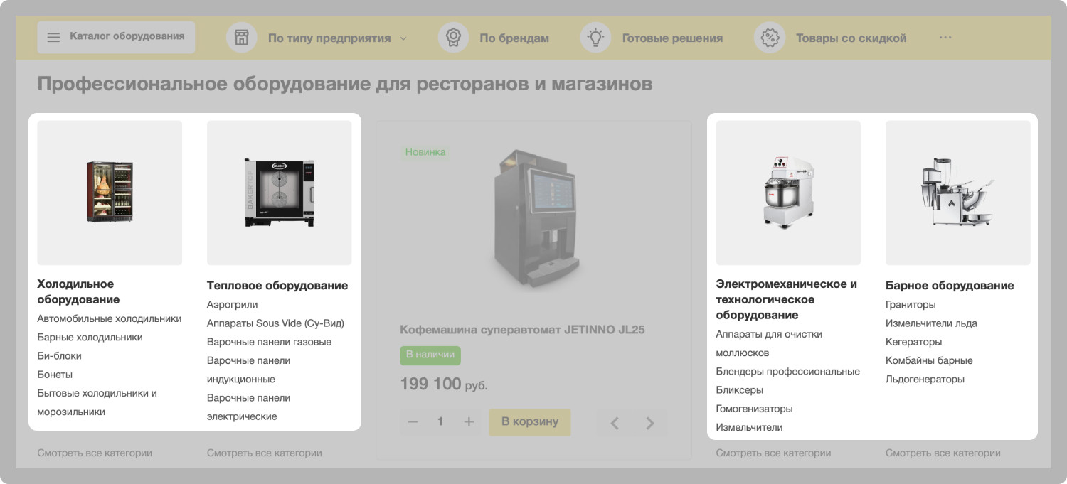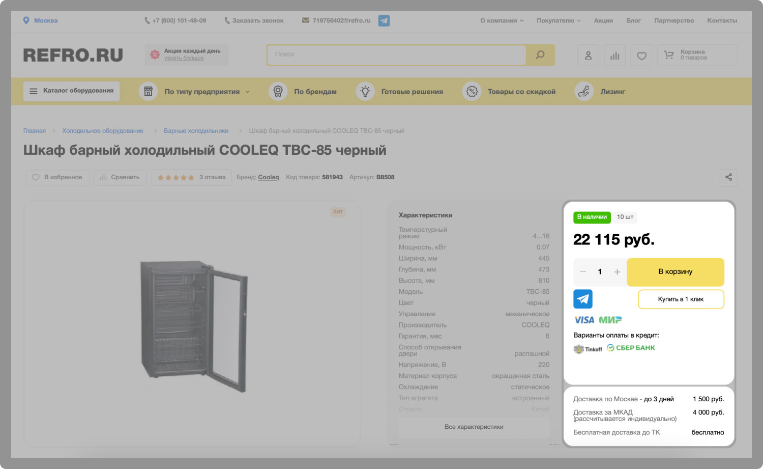 Для проекта с большим ассортиментом ключевым элементом стал поиск. На сайте клиентом был установлен более информативный поиск от платного сервиса. Такой поиск позволял сразу отсортировать товары по категориям, ценам и релевантности. Это позволяло покупателям более быстро и точно найти требуемый товар. Сделали вывод подсказок с похожими товарами, чтобы покупателям было легче ориентироваться в товарах: Данные доработки позволили пользователям быстрее находить нужное оборудование и не теряться в каталоге Главная страница должна была сразу вести пользователя к товарам. По запросу клиента мы вывели «товар дня» на главный экран. В данном блоке отображаются товары, которые являются хитами или новинками, а также товары, которые вновь появились в наличии. Кроме того, использование такого блока позволяет привлечь дополнительное внимание к товарам, требующим рекламы На главную мы вывели категории товаров. Чтобы потенциальные покупатели могли сразу попадая на сайт, легко выбрать то, что требуется. На главную страницу вывели блок с поиском товаров по брендам, так как данный вид поиска является удобным для многих покупателей Выводили отдельно кнопку каталога, а также вывели каталог товаров, разделенный по направлениям: по типу предприятия, по брендам, товары со скидкой и прочее. Поиск товаров по типу помещения позволяет легко найти технику, которая необходима для определенной сферы бизнеса — прачечная, пончиковая и др. Так, если посетителю сайта нужны товары для пиццерии — нет необходимости в поиске каждого товара по-отдельности. Достаточно перейти в соответствующий раздел, где уже собраны все товары. В каталоге оборудования на каждый тип товара были выведены популярные категории, которые пользуются наибольшим спросом среди покупателей В каталог вывели большое количество разделов для удобного поиска необходимых товаров: Вывели блок с товарами, сгруппированными по популярным производителям: Мы произвели доработку фильтра по статусам товаров: хит, новинка Также была доработка по наличию товаров: в наличие, под заказ. Все стикеры выделили цветом для лучшей наглядности При выборе подходящего товара покупатели часто ориентируются на их основные характеристики: размер, цвет, производитель и прочее. Чтобы сократить путь пользователя от поиска товара до совершения покупки, в каталоге мы вывели все основные характеристики к каждому товару. Это позволяет легче ориентироваться в товарах и быстрее находить необходимое оборудование Прежде всего мы увеличили масштаб фото товара, сделав его более крупным и акцентным: Рядом с фото товара мы вывели блок с его основными характеристиками: Проработали конверсионный блок: вывели способы оплаты, краткую информацию о доставке, сделали более заметной стоимость товара: Вывели блок с документацией к каждому товару, что позволяет покупателям ознакомиться с сертификатами и другими документами, подтверждающими качество техники: Разделили характеристики товаров по группам (заводские данные, основные характеристики, особенности и прочее), так как на стандартном шаблоне данного функционала не хватало. Поделили блок «с этим товаром покупают» на табы: похожие, хиты продаж: Проанализировав пользовательский путь, мы приняли решение сократить его на 1 шаг. Как известно, чем он короче, тем легче по