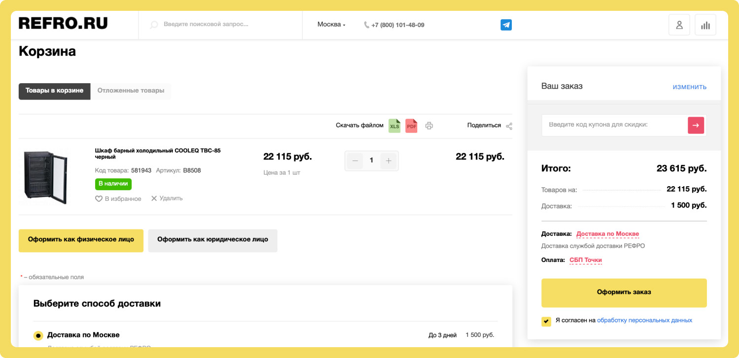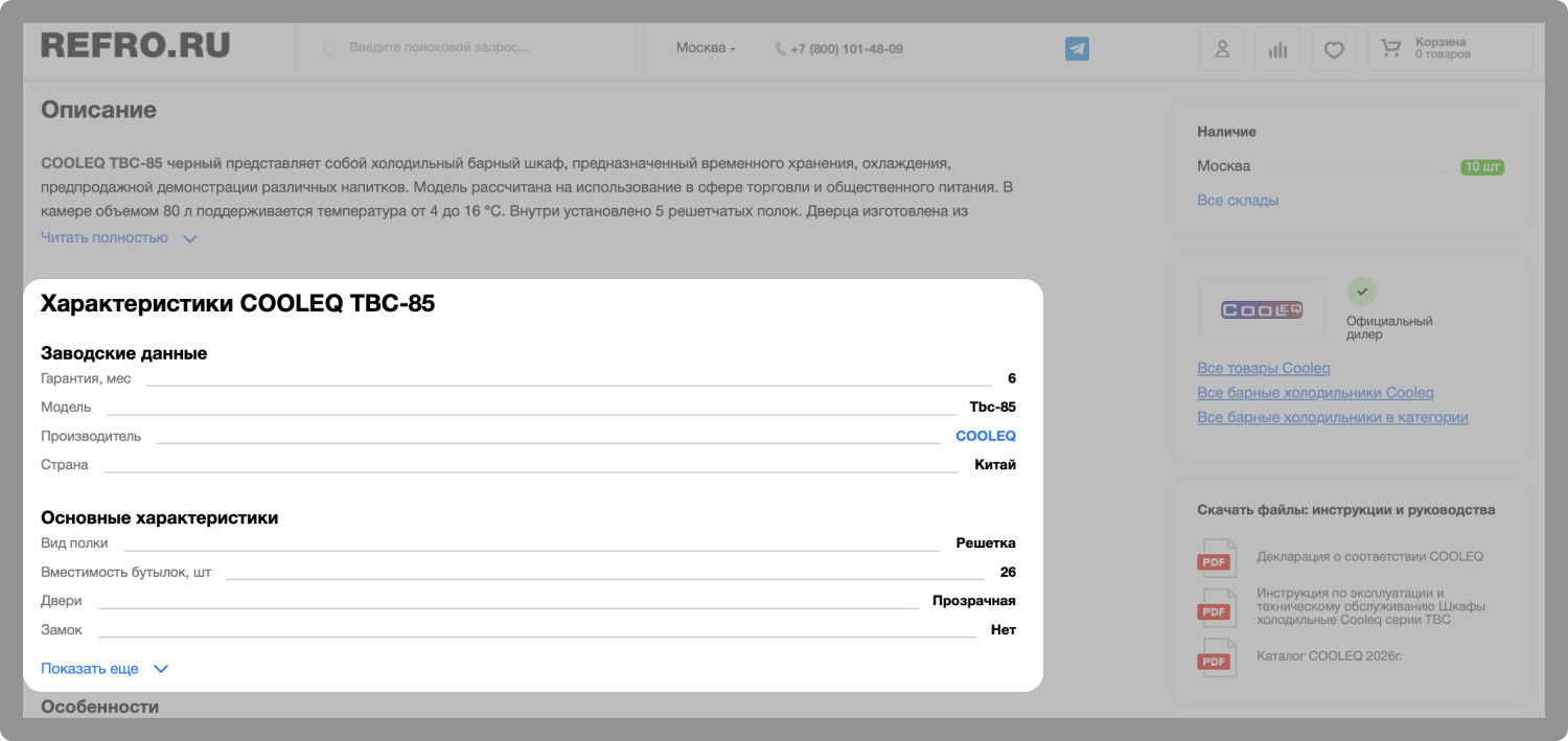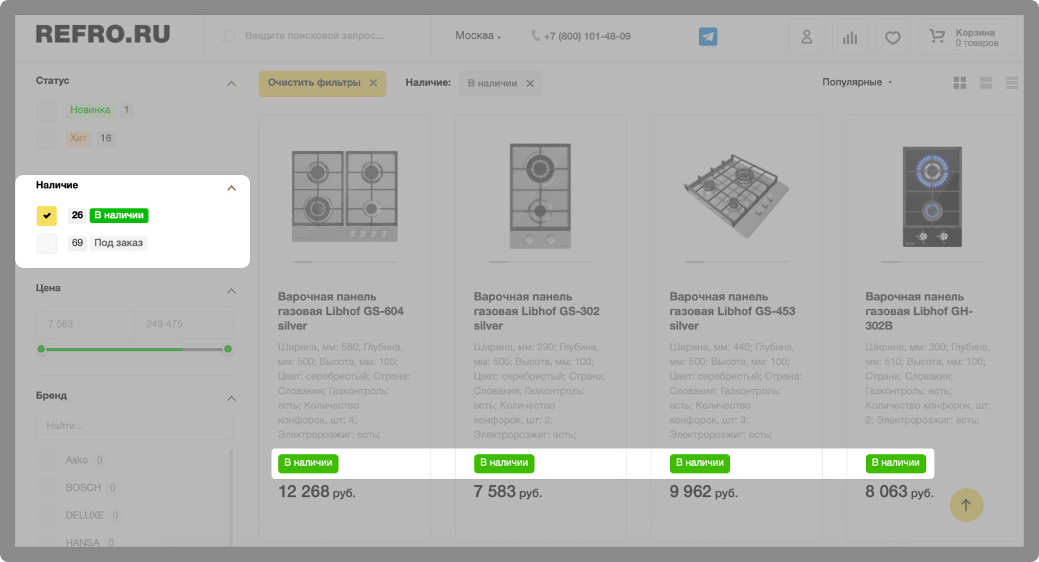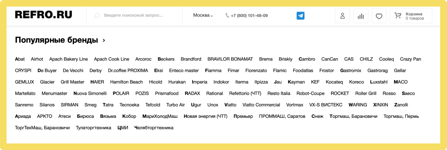 Для проекта с большим ассортиментом ключевым элементом стал поиск. На сайте клиентом был установлен более информативный поиск от платного сервиса. Такой поиск позволял сразу отсортировать товары по категориям, ценам и релевантности. Это позволяло покупателям более быстро и точно найти требуемый товар. Сделали вывод подсказок с похожими товарами, чтобы покупателям было легче ориентироваться в товарах: Данные доработки позволили пользователям быстрее находить нужное оборудование и не теряться в каталоге Главная страница должна была сразу вести пользователя к товарам. По запросу клиента мы вывели «товар дня» на главный экран. В данном блоке отображаются товары, которые являются хитами или новинками, а также товары, которые вновь появились в наличии. Кроме того, использование такого блока позволяет привлечь дополнительное внимание к товарам, требующим рекламы На главную мы вывели категории товаров. Чтобы потенциальные покупатели могли сразу попадая на сайт, легко выбрать то, что требуется. На главную страницу вывели блок с поиском товаров по брендам, так как данный вид поиска является удобным для многих покупателей Выводили отдельно кнопку каталога, а также вывели каталог товаров, разделенный по направлениям: по типу предприятия, по брендам, товары со скидкой и прочее. Поиск товаров по типу помещения позволяет легко найти технику, которая необходима для определенной сферы бизнеса — прачечная, пончиковая и др. Так, если посетителю сайта нужны товары для пиццерии — нет необходимости в поиске каждого товара по-отдельности. Достаточно перейти в соответствующий раздел, где уже собраны все товары. В каталоге оборудования на каждый тип товара были выведены популярные категории, которые пользуются наибольшим спросом среди покупателей В каталог вывели большое количество разделов для удобного поиска необходимых товаров: Вывели блок с товарами, сгруппированными по популярным производителям: Мы произвели доработку фильтра по статусам товаров: хит, новинка Также была доработка по наличию товаров: в наличие, под заказ. Все стикеры выделили цветом для лучшей наглядности При выборе подходящего товара покупатели часто ориентируются на их основные характеристики: размер, цвет, производитель и прочее. Чтобы сократить путь пользователя от поиска товара до совершения покупки, в каталоге мы вывели все основные характеристики к каждому товару. Это позволяет легче ориентироваться в товарах и быстрее находить необходимое оборудование Прежде всего мы увеличили масштаб фото товара, сделав его более крупным и акцентным: Рядом с фото товара мы вывели блок с его основными характеристиками: Проработали конверсионный блок: вывели способы оплаты, краткую информацию о доставке, сделали более заметной стоимость товара: Вывели блок с документацией к каждому товару, что позволяет покупателям ознакомиться с сертификатами и другими документами, подтверждающими качество техники: Разделили характеристики товаров по группам (заводские данные, основные характеристики, особенности и прочее), так как на стандартном шаблоне данного функционала не хватало. Поделили блок «с этим товаром покупают» на табы: похожие, хиты продаж: Проанализировав пользовательский путь, мы приняли решение сократить его на 1 шаг. Как известно, чем он короче, тем легче по