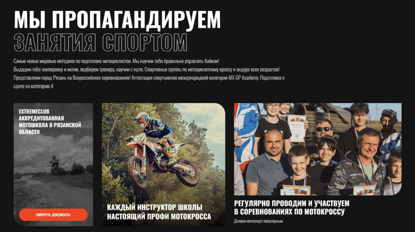 Наш клиент — профессиональная школа мотокросса в Рязани «ExtremeClub». Ребята входят в федерацию мотоспорта, постоянно участвуют в соревнованиях и занимают призовые места.