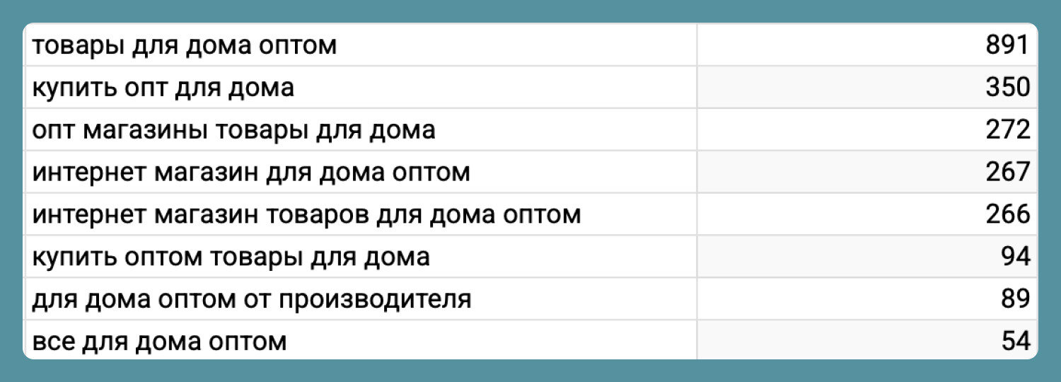 Мы собрали семантическое ядро, в которое вошли запросы разной частотности, но основной упор был сделан именно на оптовые запросы.