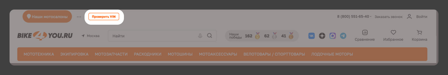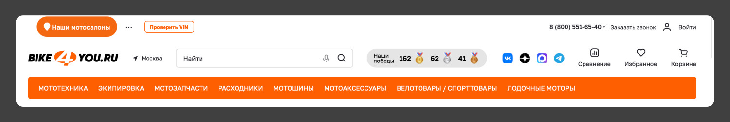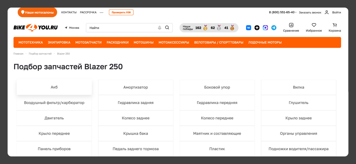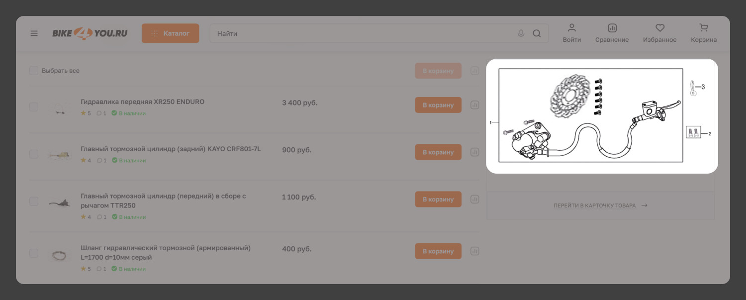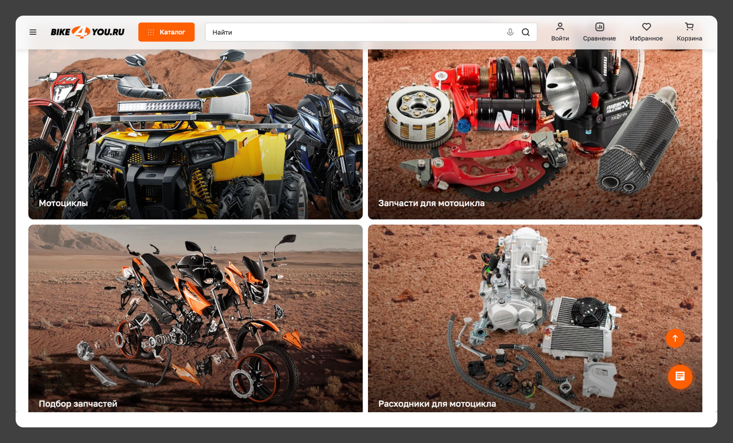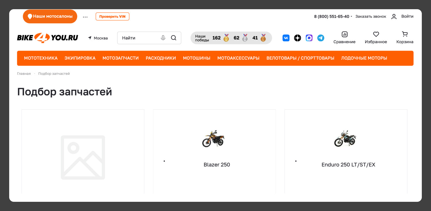 После перехода сайт стал более устойчивым и готовым к дальнейшим доработкам. Ключевая проблема проекта заключалась в нестабильной выгрузке товаров. При большом ассортименте даже небольшие ошибки приводят к некорректным данным: отсутствию цен, устаревшим остаткам или некорректному отображению товаров. Мы выстраиваем системную работу с 1С: устраняем ошибки выгрузки, налаживаем обновление данных и способствуем корректной синхронизации каталога. В результате сайт должен отображать актуальную информацию, что критично для интернет-магазина и напрямую влияет на доверие пользователей. Чтобы упростить взаимодействие с сайтом, мы переработали ключевые элементы интерфейса. На главной странице были разработаны баннеры с дизайном наших специалистов. Каждый баннер ведет в основные разделы каталога и помогает пользователю быстрее ориентироваться. Также была полностью переработана шапка сайта. Мы отказались от стандартного решения и адаптировали её под задачи клиента, сделав навигацию более удобной и логичной. Этап 4. Гибкая система оплаты В нише мототехники стандартный сценарий покупки редко работает: клиент может долго выбирать, консультироваться и менять состав заказа. Мы реализовали систему оплаты, связанную с CRM, которая учитывает эти особенности. Менеджер может формировать заказ, дополнять его и отправлять клиенту ссылку на оплату уже финального варианта. Это решение позволило сделать процесс покупки более гибким и повысить вероятность завершения сделки. Для поддержки офлайн-продаж был реализован отдельный функционал проверки VIN. Покупатель, находясь в мотосалоне, может зайти на сайт и проверить технику через официальный сервис. Это закрывает один из ключевых вопросов — подтверждение оригинальности. Такая доработка напрямую влияет на доверие к бренду и помогает менеджерам быстрее закрывать сделки. Работа с каталогом запчастей требует удобной структуры. Мы реализовали систему подбора, в которой пользователь сначала выбирает марку мотоцикла, а затем получает список категорий и деталей. Дополнительно были подключены схемы из 1С, которые помогают лучше ориентироваться в ассортименте. Это значительно упрощает поиск нужных позиций и снижает нагрузку на менеджеров. В результате сайт Байк4ю стал полноценным инструментом продаж, интегрированным в бизнес-процессы компании. Он стабильно работает с большим каталогом, поддерживает сложные сценарии оплаты, помогает как онлайн-, так и офлайн-продажам и может масштабироваться вместе с бизнесом. Проект продолжает развиваться в рамках технической поддержки. Оставьте заявку на нашем сайте и мы проведем аудит по вашему проекту — подскажем оптимальный вектор его развития