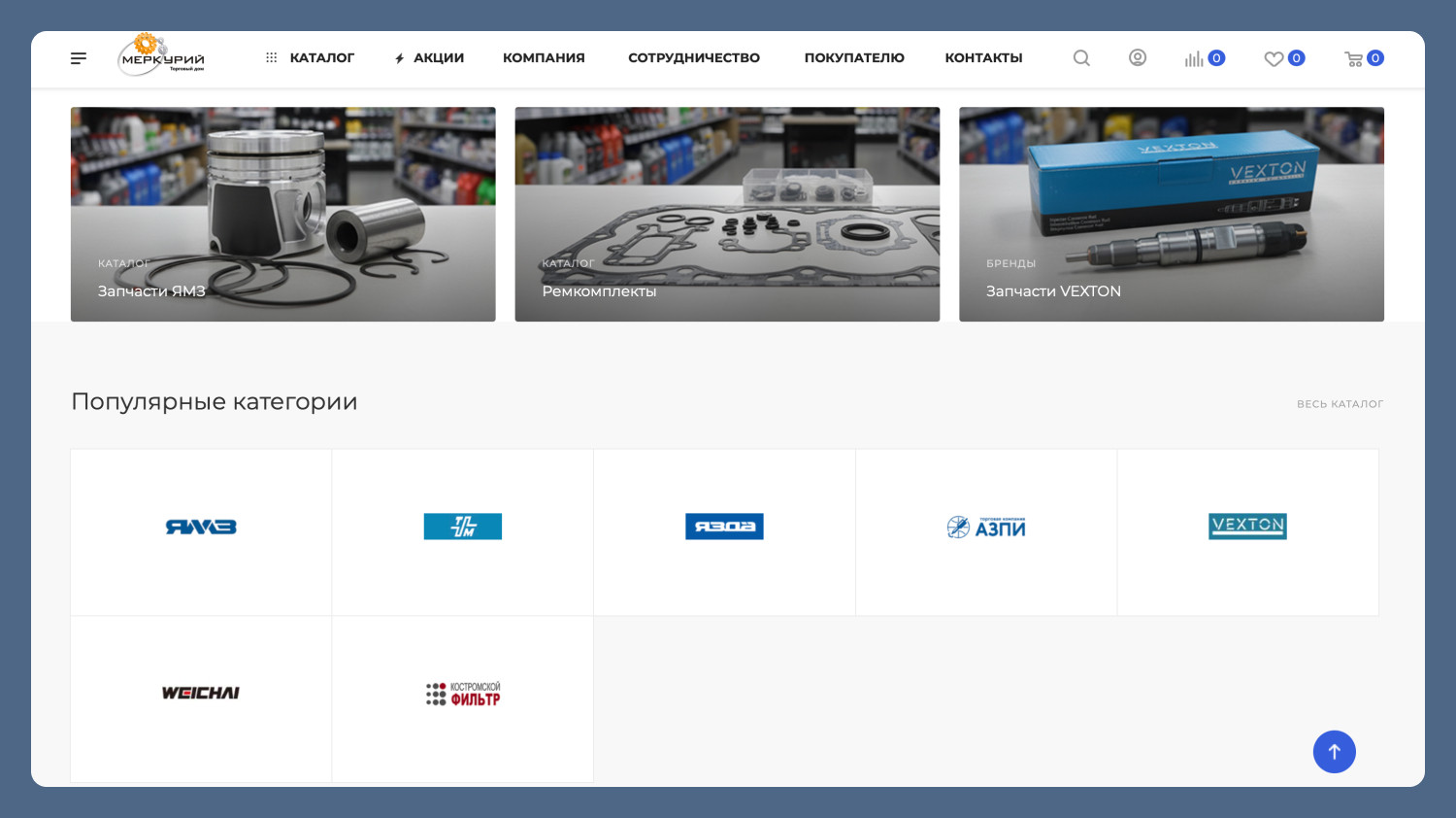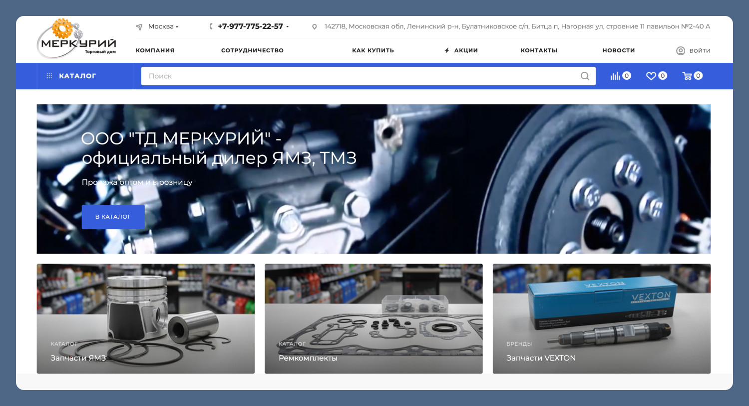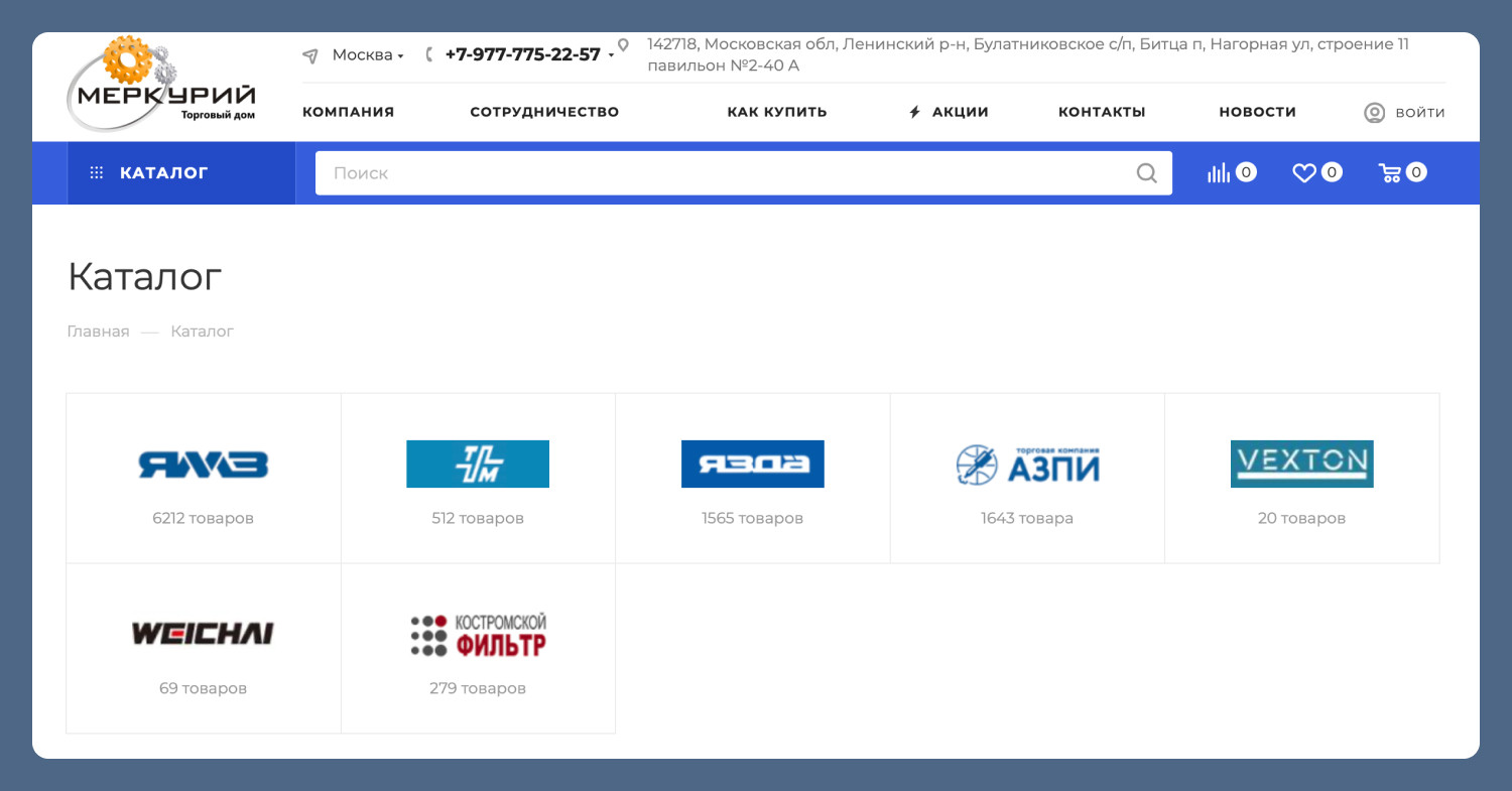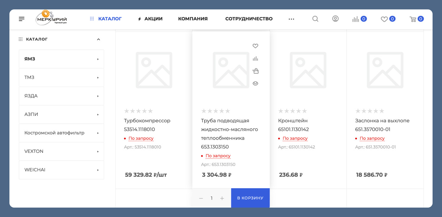 Главная страница была разработана нашим дизайнером с учётом задач бизнеса: важно было не просто представить компанию, а направить пользователя к выбору товаров. Мы выстроили структуру блоков таким образом, чтобы пользователь сразу понимал ассортимент и переходил в каталог. Поскольку у клиента на старте отсутствовала готовая интеграция с 1С, важно было избежать хаотичного наполнения сайта. Мы заранее спроектировали структуру каталога: продумали категории, вложенность и логику разделов. Под эту структуру был подготовлен файл для загрузки, который клиент заполнял товарами. Такой подход позволил сразу заложить правильную архитектуру каталога и упростить дальнейший переход на автоматическую выгрузку из 1С без переделок. После подготовки данных мы выполнили загрузку каталога на сайт. Товары были импортированы вместе с ценами и остатками. На этом этапе сайт впервые получил полноценный ассортимент, с которым уже можно работать как с инструментом продаж. К сожалению, на данном этапе многие товары в каталоге представлены без иллюстраций. В сфере запчастей такое бывает нередко, ведь в каталоге большая номенклатура. Однако мы надеемся, что в скором будущем клиенту удастся предоставить изображения товаров, после чего мы оперативно выгрузим их на сайт. Ознакомьтесь с полным описанием нашей работы по этому проекту. Рассказали о каждом этапе «что и для чего делали» и поделились результатами успешного запуска интернет-магазина!