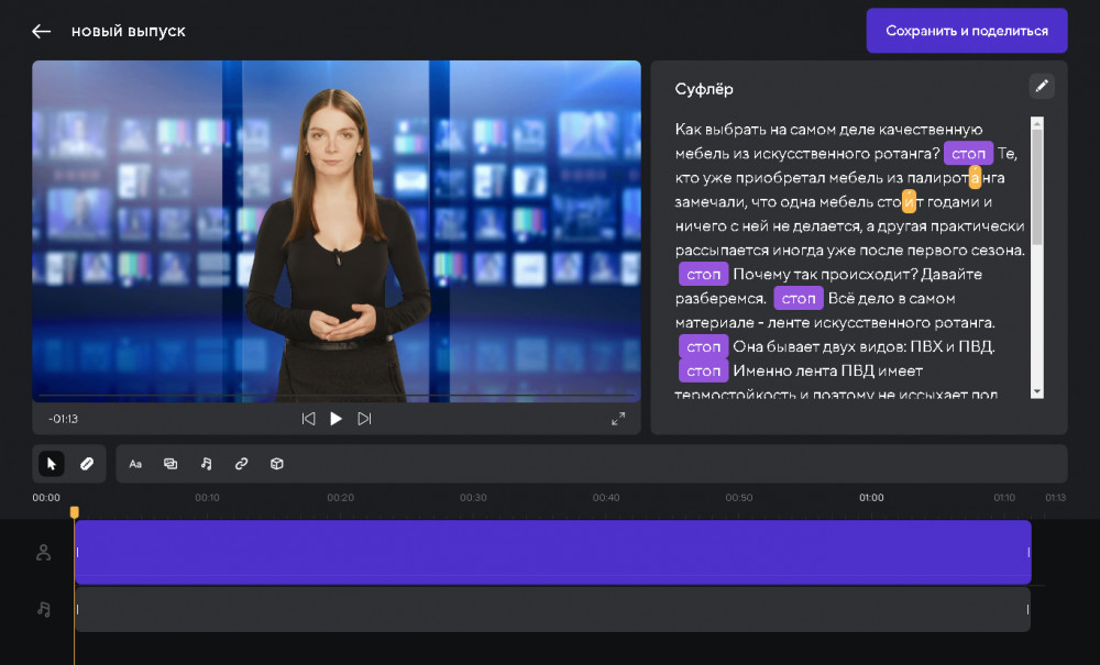 Идея сервиса интересная. Сегодня, чтобы снять видеоролик, нужен симпатичный человек с грамотной речью, хорошая камера, качественный звук, подходящий фон и многое другое. Этот сервис берёт на себя все эти задачи.