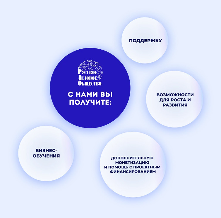 Не менее полезным окажется Российское Деловое Общество и для предпринимателей, находящихся на старте собственного дела, — наставничество, новый уровень окружения, обучение азам предпринимательства, помощь в подборе инструментов поддержки стартапов и инструменты запуска реально действующего бизнеса.
