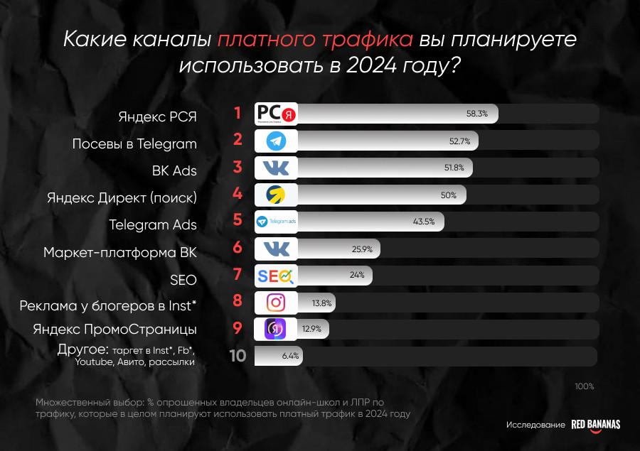 Исследование Red Bananas: 73,2% онлайн-школ увеличат инвестиции в трафик в 2024 году