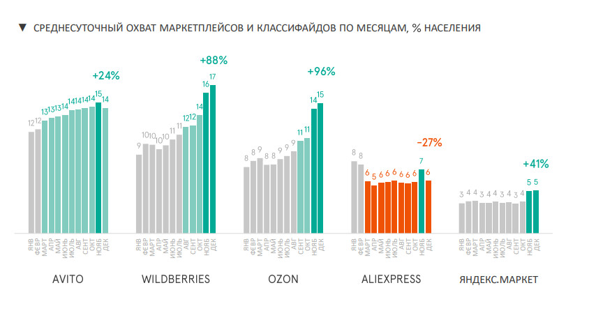 Ozon не входит в топ по суточному охвату, но входит по охвату за месяц, и более того, опережает Wildberries. А если посмотреть на соседний слайд, то Ozon сильнее всех прирос по среднесуточным охватам в 2022 году и в некоторых месяцах вплотную подобрался к WB.
