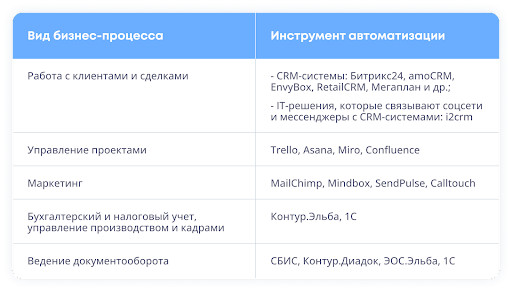 Повторимся, на рынке сотни решений для автоматизации бизнеса. По классификации чаще всего разработчики делят их в зависимости от процессов, которые алгоритмы берут на себя. Некоторые IT-продукты решают сразу комплекс задач. В таблице собрали наиболее популярные инструменты автоматизации, которые внедряют компании: В таком многообразии инструментов сложно с первого раза подобрать проверенное решение. В этом вопросе рекомендуем придерживаться четырех правил. Первое. Внедряйте инструменты автоматизации, которые применяют лидеры вашей отрасли или ниши. Не изобретайте велосипед — смотрите на тех, у кого решения уже работают. Второе. Сравнивайте схожие IT-решения по характеристикам, стоимости, отзывам.