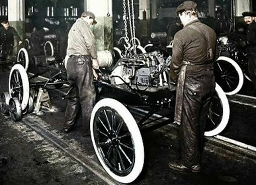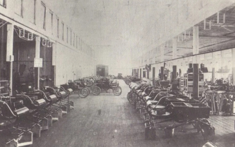 Интересно другое — в 1901-м Рэнсом запускает первый в мире автомобильный конвейер. Компании Olds Motor в тот момент всего-то четыре года, дела идут не блестяще, сам Олдс, основатель фирмы, в тот момент уже наемный сотрудник (двумя годами ранее он продал свое детище металлопромышленному магнату), и в выпуске машин он видит большую проблему: интерес к его машинам (всему модельному ряду — а Олдс работает и с бензиновыми, и с электрическими и с паровыми двигателями) огромный, а вот цена получается просто-таки пугающей. Олдс, в размышлениях о том, как снизить себестоимость, решает выяснить, как дела обстоят в других отраслях, и совершенно случайно забредает на чикагские скотобойни. К тому моменту скотобойни уже пережили свой пик, но всё ещё были красой и гордостью Чикаго, это была настоящая машина по убийству и разделке тысяч животных, а еще к скотобойням были пристроено множество заводов, которые обрабатывали кожу, производили мыло и гуталин, делали музыкальные инструменты, щетки для зубов и обуви, расчески и шкатулки — и это не считая само собой разумеющихся консервных заводов и заводов-холодильников. Но Олдса заинтересовал конвейер, устроенный весьма просто: на рельсы под потолком, прикрепленные с микроскопическим уклоном, подвешивались туши животных, которые, под тяжестью своего веса перемещались от одного рабочего места к другому. Каждый из вооруженных острием рабочих наносил всего один удар по туше своим орудием — через несколько минут разделка была закончена. Олдс страшно заинтересовался этим процессом и захотел узнать о том, как это работает, языком цифр, и владельцы скотобоен не стали их скрывать. Оказалось, что в прежние времена мясник с помощью одного-двух подручных обрабатывал тушу быка за 15 часов, а теперь группа рабочих из ста человек за одну рабочую смену (смены в те годы длились не меньше 12 часов) могла разделать туши 2700 животных. При этом час рабочего скотобойни (а для этого дела годился любой человек с улицы, квалификации эта работа не требовала) стоил вчетверо меньше, чем час работы мясника. На скотобойнях было все две профессии, требующие квалификации, на точке входа и точке выхода — это забойщик и разделочник, человек, превращавший разделанную тушу в окорока или субпродукты. Эта идея вдохновила Олдса — вернувшись к себе в Лансинг (городок, по американским меркам, невеликий, но — столица штата Мичиган), инженер перестраивает всё производство. Если раньше ставка в любом автомобильном производстве делалась на механиков высокой квалификации, то теперь нашлось место «отверточникам» — оказалось, что в процессе сборки автомобиля хватает операций, которые способен выполнить буквально любой. Олдс зафиксировал рабочие места, а строящийся автомобиль, по мере надобности, перетаскивали за канаты от одного рабочего места к другому. Позже (автомобиль — штука тяжелая) придумали установить рельсы, по которым остов машины перемещался от одного рабочего места к другому. Это был фантастический успех — к 1907-му было выпущено 19 тысяч Олдсмобилей, и эта марка стала самой популярной в мире (хотя и продавалась, в основном, в Новом Свете — возить авто в Европу тогда выглядело так себе идеей — далеко и неудобно). Гораздо дальше Олдса в разбивке процесса сборки на операции пошел Генри Форд, который, разумеется, тоже посетил Чикагские скотобо