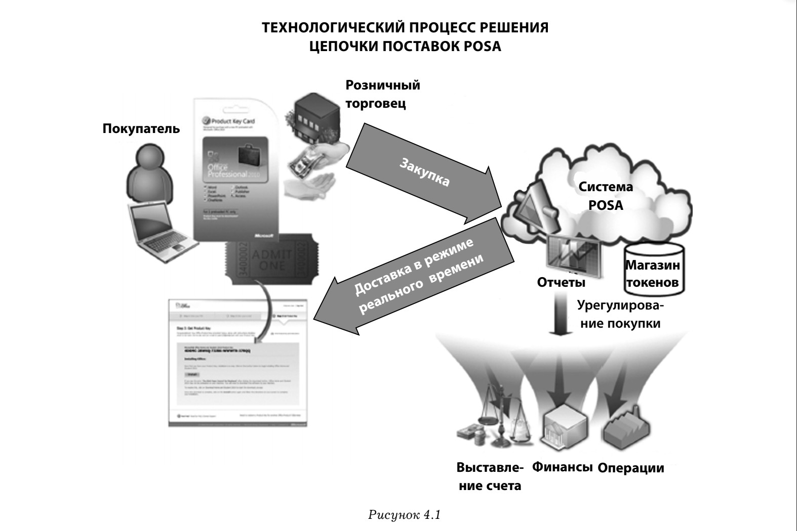 Рисунок 4.1 показывает, как работает решение POSA. Токены печатаются на карточках и загружаются в базу данных. Токены связаны с ключами, которые должны разблокировать программное обеспечение. Когда POSA-карта продается, мы получаем сообщение от продавца, который устанавливает отметку против соответствующей пары токенов и ключей в нашей базе данных. Мы используем этот запрос активации для отправки заказа клиента в нашу биллинговую и финансовую системы. Затем эти активации агрегируются в ежемесячную счет-фактуру розничным торговцам. Позже потребитель переходит на веб-сайт Microsoft, чтобы получить ключ. Если продажа не произошла, то не будет и ключа, связанного с токеном. Существует также ссылка на веб-сайт для загрузки продукта, если пользователь этого не сделал ранее.