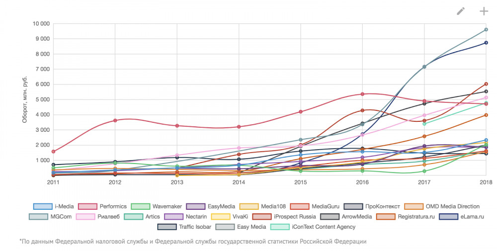 всех в абсолютном выражении в 2018 году росли лидеры рынка: MGCom и eLama. За