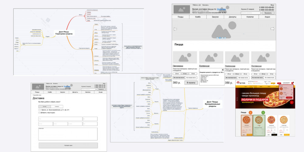 Отрисовали заготовку главной страницы: Проработали процесс заказа: Озаботились ускорением ввода контактных данных и адреса. Стремились, чтобы пользователь заполнял минимум полей, ведь с каждым лишним действием растёт шанс потери заказчика. К сожалению, пришлось отказаться от необязательной кнопки «Регистрация». По задумке можно было бы ввести личные данные единожды, чтобы впоследствии совершать заказы на один из предоставленных адресов, но фокус-группа негативно отреагировала на подобные вольности и идею реализовали иначе, создавая запись в базе данных с идентификатором по номеру телефона: Всего предложили 15 станиц прототипа, держа в фокусе простые мысли: И только потом разработали дизайн начального экрана с корзиной, отслеживаемой по cookies (3), предложениями на основе наиболее частных оплаченных запросов (4), и калорийностью готовых блюд (5): ... и личного кабинета с: На странице «Контакты» предусмотрели блок обратной связи, чтобы быстро получить рекламации, вовремя решать проблемы, исправлять ошибки, конвертируя недовольного клиента в лояльного. Кроме возможности заказать целую пиццу, реализовали сборный вариант, позволяющий составить новую из половинок, с автоматическим расчётом стоимости. Вроде просто, но режим оказался крайне востребованным: С другой стороны зеркала осталась интеграция сайта с iiko — системой автоматизации ресторанного бизнеса. Данные о заказе выгружаются и синхронизируются по API без использования сторонних решений: По итогу номенклатура сайта загружается из iiko, раз в пять минут производится синхронизация товаров. Меню создаётся однократно, заказы не задваиваются и не теряются. Тестирование подтвердило оптимизацию процессов компании, а также исключило необходимость работать в двух системах одновременно. Теперь заявки поступают напрямую в iiko, и сотрудники кухни сразу запускают готовку: Доступны как стандартные типы пиццы, так и собранные с помощью «конструктора половинок»: Учитывая требования к проекту, в качестве CMS использовали Битрикс, реализовывающий задуманные задачи стандартным функционалом. После завершения работ протестировали сайт на различных разрешениях и разных типах устройств. Оптимизировали загрузку изображений на современных и не очень гаджетах. Протестировали адаптивную версию ресурса: Заложили возможности дальнейшего развития проекта: Несмотря на бравурность слога, создание подобных проектов — кропотливая работа, требующая скоростной коммуникации большого количества сотрудников исполнителя и заказчика, гибких методик ведения проекта, строгого планирования блоков работ, тщательного отслеживания задач, финансового учёта. Может показаться странным, что в середине 2020 года пишем о разработке сайта для службы доставки, но для нас это был новый опыт, в ходе которого совершенствовались в: Результатами стали: Читайте также: Чекбоксы: песнь квадрата и галочки Как IKEA научилась зарабатывать на российских хрущевках Как обычная подмосковная шаурма стала легендарной, выросла в сеть и уперлась в тупик Брайан Робертсон — Spark: «Холакратия не подходит компаниям из Кремниевой долины»