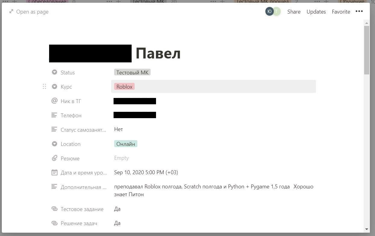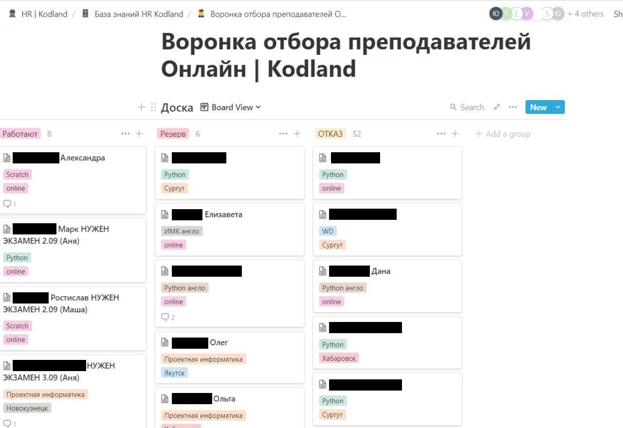До коронавируса менеджеры работали «руками». Мы самостоятельно разбирали каждое резюме, проводили собеседования и составляли индивидуальные вопросы даже для менеджеров по холодным звонкам. Результат «пять наймов в неделю» не устраивал никого. Еще одним «кнутом» стали пришедшие с рекламы лиды. Помимо самостоятельного поиска, отдел не справлялся с потоком писем соискателей. После каждого удачного собеседования мы рисковали потерять ценные кадры. Информацию о соискателе приходилось искать сразу в нескольких источниках. Случалось, что спустя месяц после успешного прохождения педагог не получал ответа и сам интересовался, не забыли ли мы про него. Приходилось извиняться и искать выход из сложившейся смуты. Создание анкеты Прежде всего мы должны были разобраться с работающими лидогенераторами. Наши вакансии размещены в HH, LinkedIn, Telegram-каналах, Яндекс-талантах и Вконтакте. Для автоматизации подбора мы использовали созданные в Google форме анкеты. Неважно обратили ли на нас внимание в LinkedIn или в HH — все соискатели проходят через этап заполнения анкеты. Это значительно сократило наше время на сортировку писем и разбор резюме на сайтах. Анкета позволила сразу получать интересующие нас ответы по каждой вакансии. Метод ускорил фильтр резюме и отказ от не релевантных кандидатов. Автоматизация найма Прошедшие анкетирование кандидаты попадают на первичное собеседование или видеоинтервью. Последнее используется для поиска специалистов колл центра. Ссылку на видеоинтервью отправляем в «телеграмме» вместе со вступительным словом и гайд-роликом. Запись помогает выявить дефекты речи, дикцию, следование скриптам и другие вербальные навыки. Такой формат позволил руководителю отдела значительно сократить время, избегая прямых собеседований. Тестовые задания В отличие от профессий рутинного труда полностью автоматизировать подбор педагогов и менеджеров вводных уроков невозможно. После заполнения анкеты кандидаты проходят интервью с HR-менеджером и после получают тестовое задание. Результаты автоматически перенаправляются методистам, которые позже отправляют списки прошедших кандидатов в Telegram-группу. После мы проводим тестовый урок, чтобы понять знания специалиста, способность отвечать на вопросы, а также проверяем качество интернета, помогаем подобрать задний фон и стиль одежды. Карточки в Notion Рынок онлайн-образования всегда отличался большой текучкой преподавателей. Часть специалистов совмещают занятия в частных школах постоянной работе в вузе или ИТ-компаниях. Мы проводим уроки по выходным, поэтому для соискателя это отличный вариант для подработки. Перевод занятий в университетах и выход компаний на удаленку стали еще одними драйверами роста интереса к вакансии. Справиться с постоянным потоком резюме нам помог Notion. Все воронки подбора, задачи HR-отдела, описания вакансий мы оформляли в платформе. Для соискателей заводится карточка в Notion с краткой информацией, личными данными и приложенным резюме. Созданная CRM также позволяет хранить видеоинтервью, результаты тестирования и контакты утвержденного кандидата. Результат За прошлую неделю три HR-менеджера набрали 30% к штату школы. Мы успели обработать 110 заявок и набрать 30 человек в команду. За месяц было рассмотрено свыше 1500 лидов и отобрано 91 сотрудника. Сейчас компания 