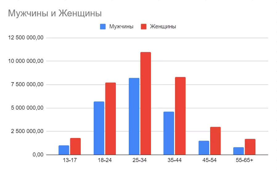 Количество пользователей Instagram в разных возрастных категориях, по данным Рекламного кабинета Facebook