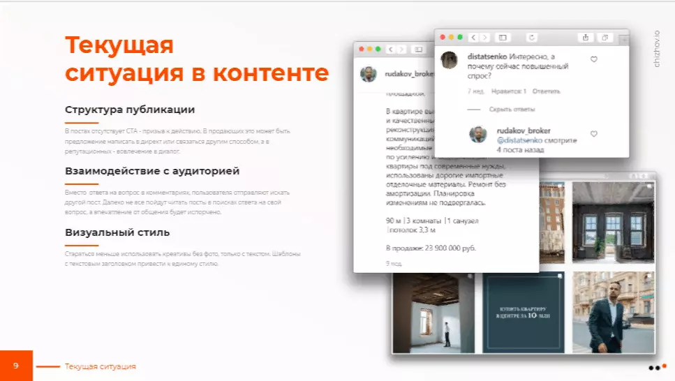 Во-вторых, аудитория перестает быть сугубо женской. В сегментах от 18 до 34 лет доля мужчин достигает 42%. В остальных — их более трети. Общий объем аудитории Instagram, по данным Mediascope Общая посещаемость сети в России — 59 миллионов человек в месяц. Это восьмое место среди всех сайтов и второе — среди социальных сетей после «ВКонтакте». При этом аудитория Instagram гораздо активнее, чем у ВК. По данным Brand Analytics, здесь 42,8 миллиона активных авторов. Таковыми считают аккаунты, которые в течение месяца размещают хотя бы один пост или пишут хотя бы один комментарий к постам других пользователей. То есть 72% пользователей инсты — это точно живые люди, которых можно вовлекать и делать клиентами своего бизнеса. Mediascope выяснили уровень дохода и род деятельности пользователей Instagram. Получилась такая картина: Уровень дохода и род занятий пользователей Instagram, по данным Mediascope Больше всего в «Инстаграме» специалистов и людей рабочих специальностей. Чуть меньше, но тоже много руководителей, служащих, учащихся и людей без определенного способа заработка. Большинство пользователей оценивают доход семьи как средний и выше среднего. Недавно Hootsuite выяснили, что 200 миллионов пользователей Instagram взаимодействуют с бизнес-аккаунтами. Это каждый шестой пользователь платформы во всем мире. То есть в России около десяти миллионов человек готовы взаимодействовать с брендами. У сети магазинов косметики «Л’Этуаль» более 7 миллионов подписчиков А у IKEA Russia — почти 2,5 миллиона GlobalWebIndex в прошлом году опросили людей и выяснили, как именно социальные сети влияют на решение о покупке. Как пользователи используют социальные сети, по отчету Social Media Trends 2020 от Global Web Index Самое главное: В стратегии продвижения важно учитывать, что Instagram может быть как последним этапом воронки продаж, так и промежуточным. Пользователи могут следить за брендом в соцсетях, а делать покупки на других площадках: в интернет-магазине, маркетплейсе или офлайне. Кто-то здесь может усмехнуться и сказать, мол, плавали, знаем. Цифры у вас хорошие, только продаж нет ни фига. И эти люди даже будут правы. Еще в 2018 году Roistat посчитал средний ROI (показатель возврата инвестиций) для разных рекламных каналов, и получилось вот что. Средний ROI рекламных каналов, по данным Roistat За два года фундаментально ничего не изменилось. Отдача от социальных сетей не отбивает инвестиции в них. И это реальность, потому что Бизнес неправильно работает с соцсетями Чаще всего SMM путают с настройкой таргетинга. Попытался продавать в лоб, открутил рекламу на холодную аудиторию, получил отчет с сумасшедшей ценой лида и продажи — и давай до свиданья, этот ваш «Инстаграм» не работает. Ребят, не надо так. Дальше по шагам рассказываем, как делаем SMM мы в «Студии Чижова». Это работает. Проверено десятками проектов от мастеров хендмейда до крупных федеральных сетей в разных нишах. Фрагмент аудита текущего состояния аккаунта Что делаем, если Instagram уже есть: На этом этапе нужно понять, что не так с бизнес-аккаунтом сейчас, что надо сделать, чтобы стало так, сколько это будет стоить и сколько времени понадобится. Анализ конкурентов отвечает на два больших вопроса: Фрагмент отчета по конкурентному анализу На этом этапе выделяем самых успешных конкурентов, распределяем их по категориям (прямые, косвенные) и разбираемся, как они работают: что именно рекламиру