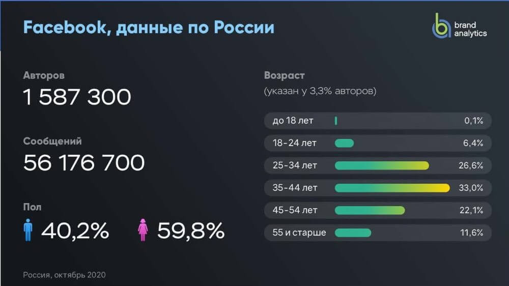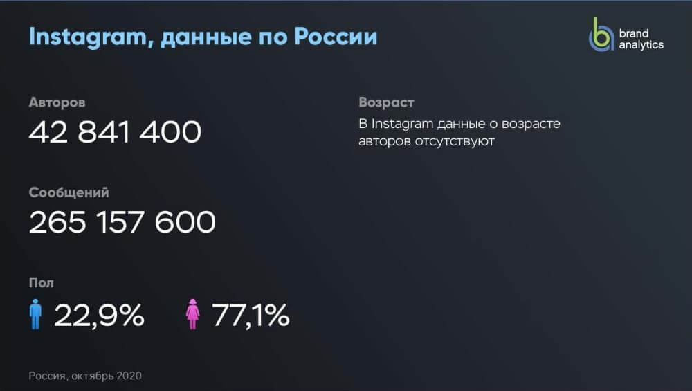 Чтобы представить в целом аудиторию соцсетей, обратимся к статистике Brand Analytics 2020 года.