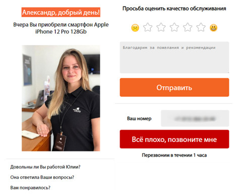 Получившийся набор передали Битрикс-разработчикам. Созданные блоки заполняли именами и названиями из 1С: сайт работал в режиме «телевизора». Спрашивали мнение покупателей о продавцах, измеряя удовлетворённость. Опирались на привычный шаблон действий: оценивать приложения смартфона и водителей служб такси.