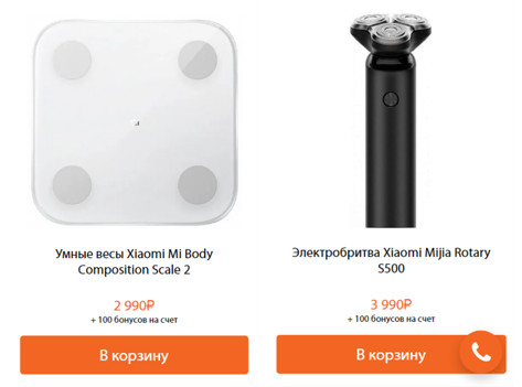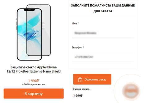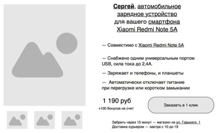 1. Фото и описание товара с кнопкой обратного звонка и заказа.