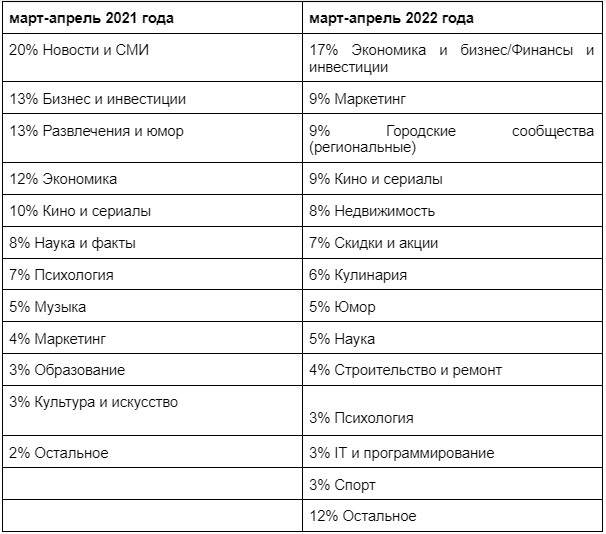 Интересно сравнить, как изменилась конъюнктура популярных тематик для рекламных размещений в каналах и пабликах Telegram и VK в марте-апреле 2021 и 2022 года: * по статистике SocialJet Как видно из таблицы, спрос на рекламу в финансовых и экономических каналах уменьшился более чем в 2 раза, теперь их логичнее объединять в одну категорию. Тоже самое произошло с юмором и психологией. При этом рекламы в городских сообществах, каналах пишущих о кулинарии, скидках и строительстве стало значительно больше. Интересно, что и недвижимость стала более востребованной категорией. Заметно выделяется обобщенная категория «Остальное», которая за последние два месяца охватила 12% от всего спроса по разным тематикам каналов. В нее вошли авторский контент, авто и мото, туризм, новости, дизайн и интерьер, здоровье, образование и музыка. Не исключаем, что в дальнейшем ситуация будет иной, но что-то прогнозировать сейчас очень сложно, т.к. непонятно, как изменятся приоритеты тех, кто одновременно тестирует обе платформы и тех, кто временно приостановил рекламу. В любом случае мы будем следить за развитием рынка и активностью рекламодателей.