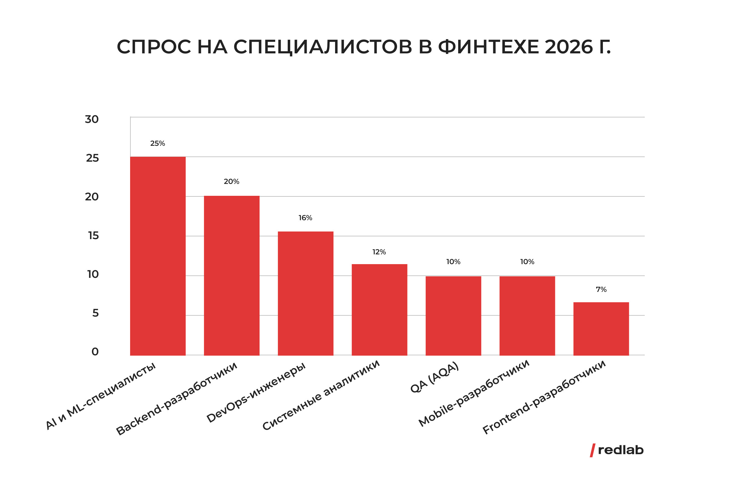 Если говорить о российском рынке, исследование Smart Ranking показывает, что в 1 полугодии 2025 года выручка топ-100 финтех-компаний составила более 129 млрд рублей, увеличившись на 15,7% по сравнению с аналогичным периодом 2024 года. Наибольший рост зафиксирован в сегменте переводов средств — за счет платформенных решений и встроенных финансовых сервисов, позволяющих интегрировать мгновенные переводы прямо в приложения и обеспечивать пользователям удобный доступ к расчетам внутри экосистемы. Наименьшую динамику показал сегмент кредитования. Несмотря на то, что многие российские компании столкнулись со значительным снижением инвестиций, ИНК посчитал: 36% респондентов увеличили вложения в 2025 году — в основном банки и ритейлеры, вынужденные соблюдать регуляторные нормы и усиливать меры безопасности. В целом, совокупность технологических инвестиций, дефицита квалифицированных ИТ‑специалистов и усиливающейся конкуренции формирует устойчивый спрос на сильные команды как на глобальном, так и на рынке РФ. При этом аутсорсинг и аутстаффинг становится не просто временным инструментом — это полноценная стратегическая модель для быстрого достижения бизнес-целей. В 2026 году ожидается постепенное снижение доли штатного найма. Содержание инхаус-команд становится дороже, а закрытие позиций уровня Middle и Senior требует все больше времени. В результате компании будут чаще использовать аутстаффинг как инструмент оперативного привлечения специалистов под конкретные задачи. Одновременно темпы роста аутсорса, вероятнее всего, замедлятся. Финансовый сектор традиционно предпочитает сохранять контроль над ключевыми системами и развивать критичные компоненты внутри собственных команд. Поэтому проектная разработка будет применяться ограниченно. RedLab прогнозирует следующее распределение моделей найма ИТ-специалистов (одна компания может применять несколько форматов одновременно): Средний срок аренды ИТ-специалистов будет составлять 12 месяцев. Наиболее долгий средний срок привлечения зафиксирован для экспертов уровня Middle — 20 месяцев, Senior — 16 месяцев. Наш опыт подбора персонала для FinTech показывает: именно эти позиции продолжают формировать ключевую потребность отрасли в квалифицированных кадрах: Таким образом, финтех-сектор России в 2026 году продолжит активно арендовать ИТ-специалистов, чтобы ускорять внедрение новых функций, поддерживать высокий уровень технологической зрелости и повышать стабильность систем. ____ Основные выводы: На фоне экономической неопределенности FinTech стал более избирательными и прагматичными. Вместо масштабных многолетних проектов компании чаще заказывают точечные услуги или команды под конкретные, ограниченные по времени задачи. Спрос на гибкие модели сотрудничества — аутсорса и аутстаффинга — заметно вырос. Такой подход позволяет оптимизировать расходы без снижения качества. Сегодня ИТ-партнеры выступают не просто поставщиками услуг, а стратегическими компаньонами, которые помогают организациям быстрее достигать целей. Например, ИТ-компания RedLab наравне с бизнесом заинтересована в развитии продуктов, ставит цели и делает шаги к их реализации. Такой формат сотрудничества позволяет выводить продукты на новый уровень качества и сократить time-to-market благодаря кросс-индустриальной экспертизе специалистов и