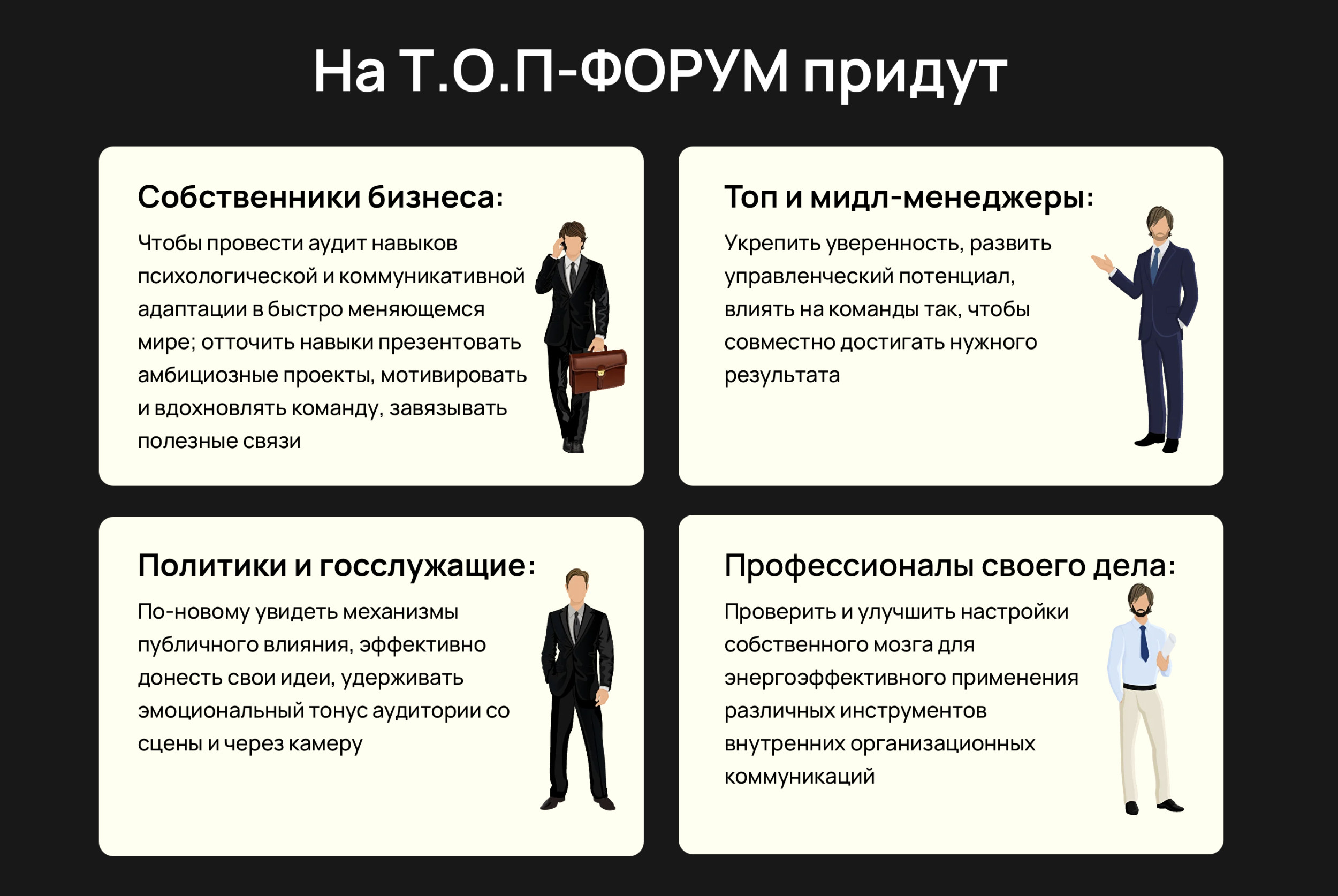 Александра: Программа «Т.О.П. Форума» напоминает книгу-игру, где читатель сам выбирает, на какую страницу отправиться и в какое развитие сюжета погрузиться. Мы предусматриваем несколько треков, то есть в день интенсива участники смогут выбирать наиболее интересные и подходящие для себя. Маршрут интенсива определит вектор дальнейшего развития.