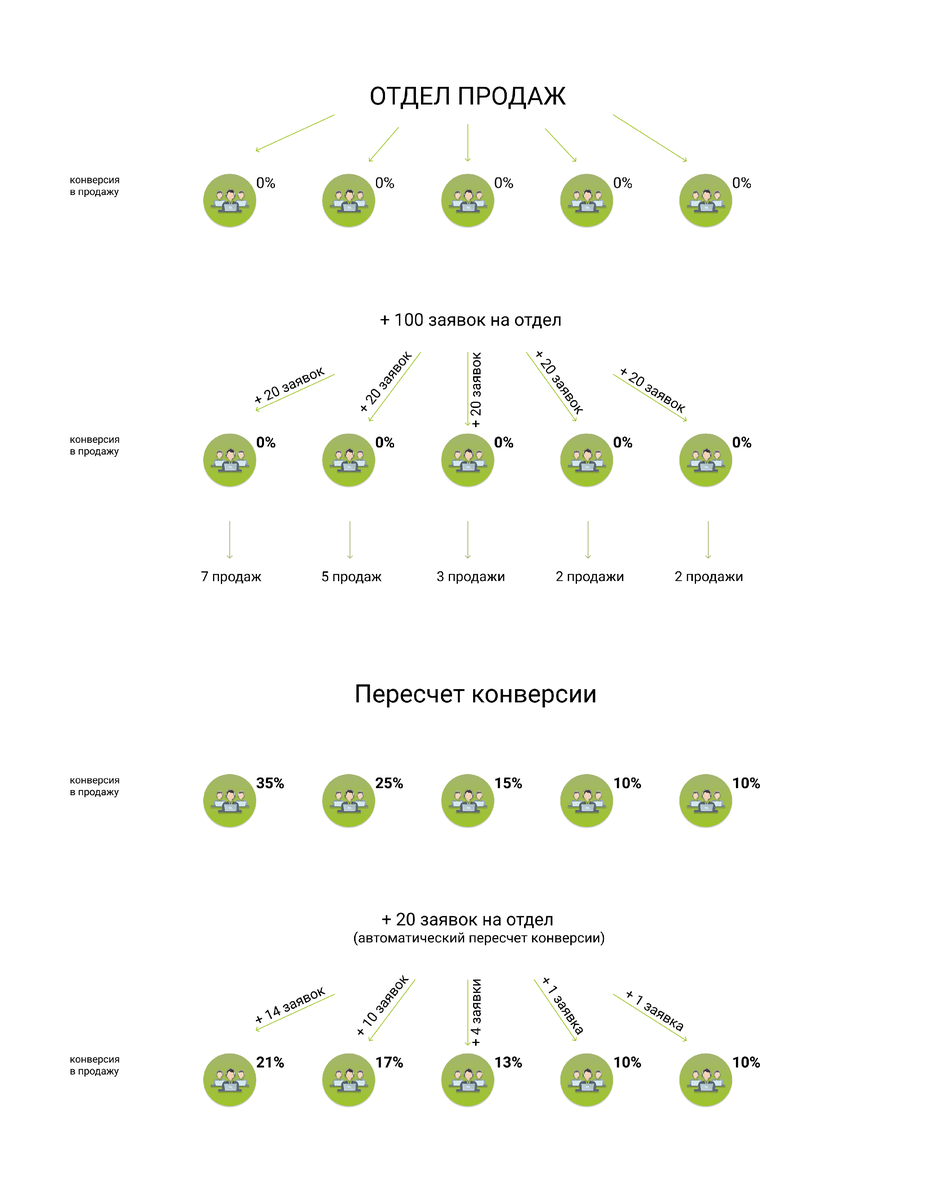 Но если система будет постоянно передавать эффективному менеджеру бОльшее количество заявок, чем остальным, то через 1-3 недели он перестанет справляться с нагрузкой, его конверсия начнёт стремительно падать и сравняется с конверсиями других менеджеров.Мы предусмотрели это! Система является саморегулируемой, она сама отслеживает высокую нагрузку на менеджеров и в реальном времени перераспределяет заявки на сотрудников с наибольшей конверсией.