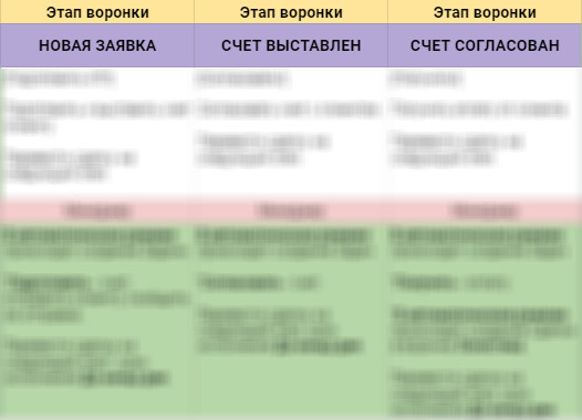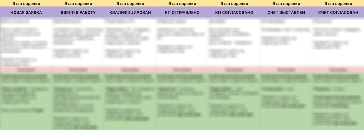 Каждый этап воронки продаж мы детально проработали: — назвали этапы согласно технологиям продаж — прописали действия и цели менеджера, которые необходимо выполнить на текущем этапе (перевести сделку на следующий этап сотрудник сможет только после выполнения описанных задач) — назначили ответственных за сделки — прописали автоматическую постановку задач на каждом этапе с нужным дедлайном — прописали типы задач, чтобы можно было отслеживать, на что больше всего времени уходит у сотрудников во время продажи — прописали дополнительные точки касаний — прописали специфическую нишевую информацию, необходимая для квалификации клиента и перенесли её в CRM в виде полей.