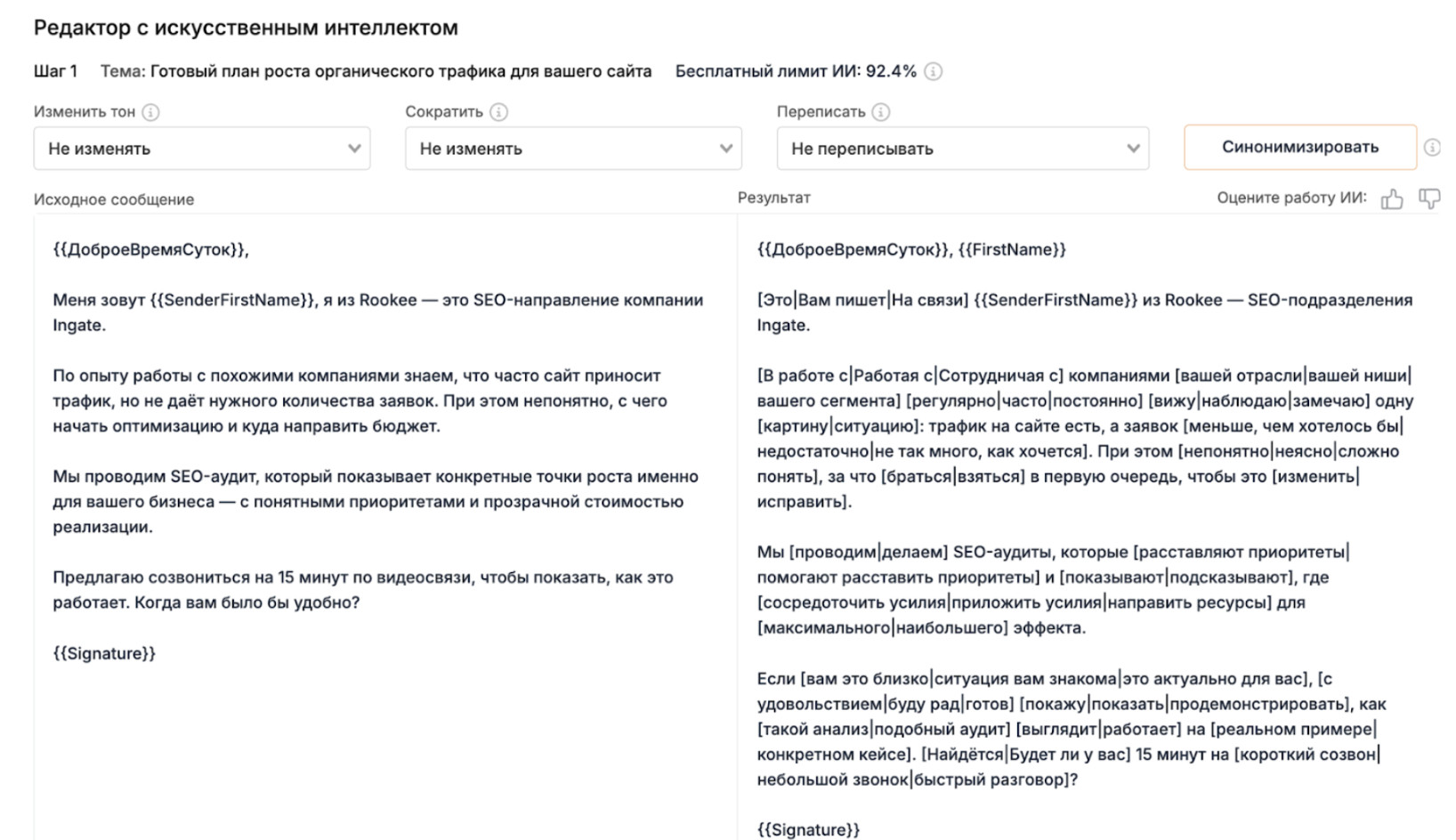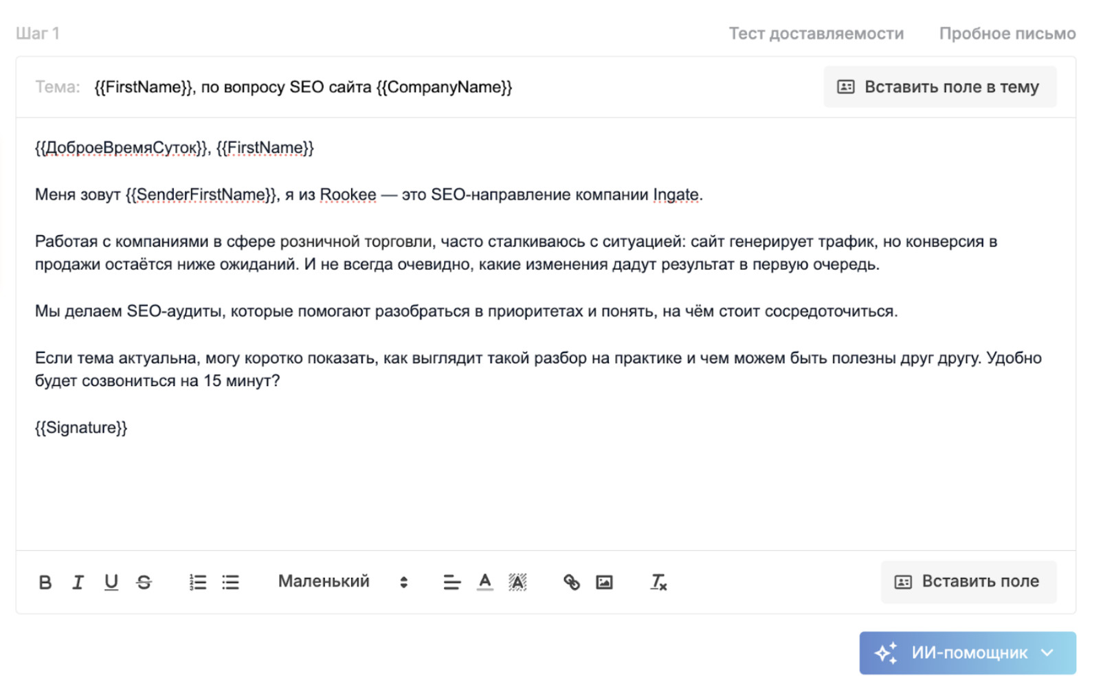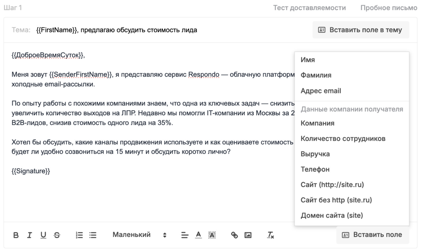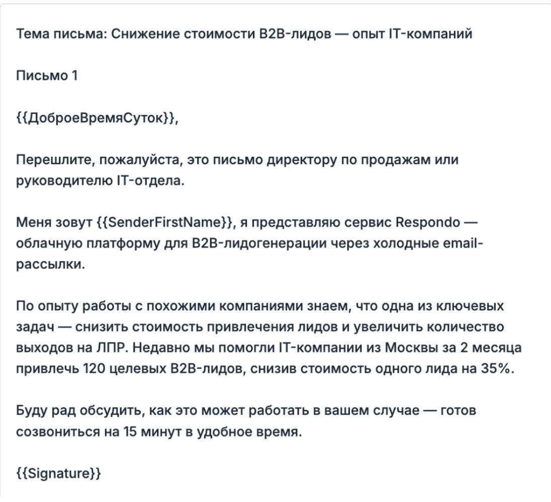 В этом случае письмо должно быть максимально конкретным и релевантным. ЛПР мгновенно считывает, понимаете ли вы его задачи или просто рассылаете шаблон по базе. Персонализация здесь критична: упомяните конкретный проект компании, публикацию руководителя, отраслевую проблему. Покажите, что вы изучили контекст, а не просто подставили имя в шаблон. Призыв к действию должен быть легким и необременительным. Не «ознакомьтесь с нашим КП на 12 страниц», а «удобно ли будет созвониться на 15 минут на этой неделе?». ЛПР принимает решения быстро, и если письмо выглядит как простой деловой запрос от человека, который понимает его бизнес, шанс получить ответ кратно возрастает. Сценарий 2: Вы пишете на общую почту компании. Это самый частый случай, особенно когда личные контакты ЛПР найти не удалось. Письмо на info@, office@ или reception@ попадает к секретарю, ассистенту или специалисту, который разгребает десятки, а иногда сотни входящих в день. Этот человек не оценивает ваше УТП, не сравнивает вас с конкурентами, он просто решает: важное это письмо или нет, и кому его переслать. Секретарь не принимает решение о покупке. Его задача, фильтровать поток. Поэтому письмо должно выглядеть как обычное деловое обращение, а не как рекламная рассылка с баннерами и кнопками. Любой намек на массовую промо-рассылку, и письмо отправляется в корзину, не дочитав первую строчку. Задача вашего письма в этом сценарии совершенно конкретна: содержать понятную просьбу переслать нужному человеку. Вот формулировки, которые работают: Просьба связать с нужным человеком по деловому вопросу, это простая и понятная для секретаря задача, которая лежит в его зоне ответственности. Кстати, в Respondo есть инструмент подбора релевантных email-адресов компании из собственной базы. При импорте контактов сервис дополняет ваш список дополнительными адресами: job@, hr@, director@ и другими, которые собраны с сайтов организаций. Это повышает шанс попасть сразу к нужному человеку, минуя секретаря, и снижает число жалоб на спам. Теперь разберем, как написать холодное письмо по элементам. Каждый блок выполняет конкретную задачу, и если убрать любой из них, конструкция развалится. В Respondo есть умный ИИ-редактор, который составляет цепочки писем на основе тысяч успешных кампаний. Работает просто: вы заполняете данные о своей компании, целевой аудитории и оффере, а ИИ-редактор сам генерирует готовые тексты писем с учетом лучших практик, которые мы накопили за все время работы. Дальше в статье мы будем использовать примеры именно из ИИ-редактора Respondo, чтобы показать, как выглядит каждый элемент на практике. Тема письма — это первое, что видит человек в почтовом ящике. И если тема выглядит как реклама, письмо удалят, даже не открыв. Никто не будет читать сообщение, которое на первый взгляд выглядит как реклама.. Но есть проблема посерьезнее: письмо может вообще не дойти до получателя. Спам-фильтры анализируют тему и отправляют всё подозрительное в спам, где его никто не найдет, поэтому тема холодного письма должна выглядеть как обычная деловая переписка, а не как промоакция. Несколько принципов, которые работают: Краткость: оптимальная длина темы: 3–7 слов. Длинные темы обрезаются в мобильных почтовых клиентах, а с телефона читают почту более 60% руководителей. Конкретика вместо общих фраз. Тема должна сигнализировать,
