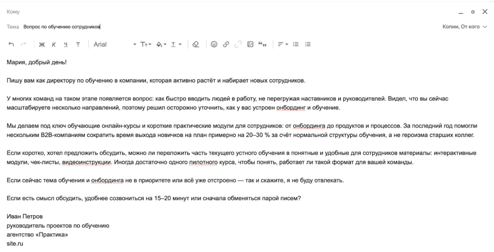 Ошибка 4: Нет персонализации. «Уважаемый руководитель!» Из письма видно, что оно ушло одновременно тысяче адресатов, и вы даже не потрудились вставить название компании. Хватит одной детали: упоминание свежей публикации компании, конкретного кейса или типичной для отрасли получателя задачи сразу превращает письмо из шаблонной рассылки в персональное сообщение.