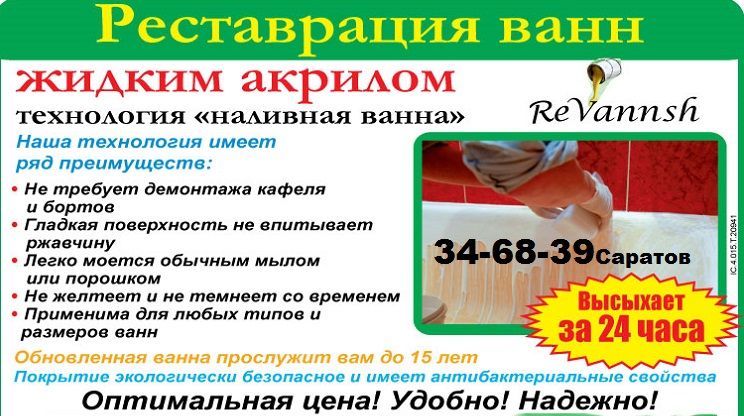 Организация предлагает: Эмалировка ванн. Реставрация ванн жидким акрилом. на дому т 346839 Саратов. Энгельс. Область. Мы предлагаем 2 способа обновления покрытия ванн.Первый способ: покрытие ванны специальной эмалью для ванн производство Германия. Трех-компонентная эмаль на основе эпоксидной смолы. Время высыхания 3 дня, срок службы 6 лет, время работы зависит от состояния ванны в среднем занимает 2-3 часа, цвет покрытия на выбор (белый, голубой, салатный, синий, зеленый, розовый)-Второй способ :покрытие жидким акрилом(метод наличная ванна) производство Финляндия время высыхания 1 день срок службы покрытия 10 лет время работы зависит от состояния ванны в среднем занимает 2-3 часа цвет кипельно белый. На нашу работу мы даем гарантию в письменном виде. Качество и срок службы проверили временем. Организация работает с 2003 года т.346839 т. 934674 89053846839