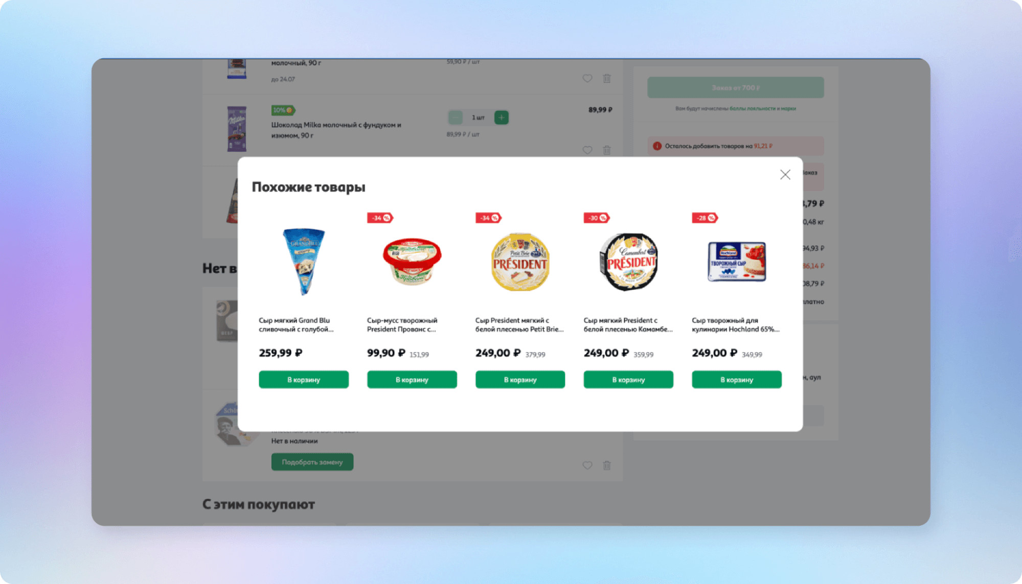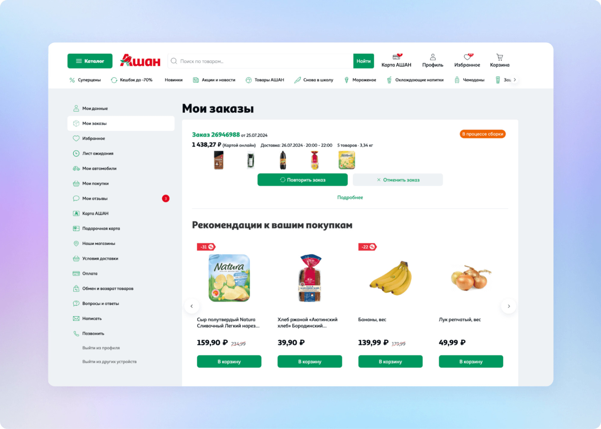 Раньше выбывший из наличия товар выделялся в отдельном блоке «Нет в наличии»: пользователи почти никак не могли с ним проконтактировать. Единственный вариант — перейти в карточку товара и подобрать какие-нибудь позиции из рекомендаций. Но так почти никто не делал. Чтобы сделать поиск аналогов более интуитивным, добавили в корзину кнопку «Найти замену» и сделали на ней большой акцент. При нажатии этой кнопки со стороны АШАН в Retail Rocket Group передаётся ID товара «не в наличии». На основе полученных данных платформа подбирает похожие товары, которые отображаются у пользователя в отдельном виджете. При этом подбирается не одна позиция, а целая серия, чтобы увеличить вероятность покупки. Личный кабинет пользователя входит в топ-6 по количеству ежедневных посещений и глубине просмотра среди всех страниц интернет-магазина АШАН. Но несмотря на большой трафик, он не достаточно эффективно конвертировался в покупки. Чтобы исправить ситуацию, решили добавить персональные рекомендации. На основе просмотров пользователя и прошлых покупок в личном кабинете создаётся уникальная подборка товаров, которые он с большой вероятностью купит и в этот раз. Сейчас 6% кликов по блоку рекомендаций конвертируется в заказ. На главной странице сайта появилась товарная полка с новинками из 10 самых популярных категорий. При этом пользователь может фильтровать новинки по категории, которая его интересует. Например, молоко, мясо птицы, сладости и так далее. Хотя у алгоритма и нет серьёзного влияния на товарооборот, он значительно увеличивает количество просмотров, 3% из которых конвертируются в добавление в корзину. Пока алгоритм работает только на адаптивной и десктопной версии сайта, в ближайшее время планируется интеграция в мобильное приложение.