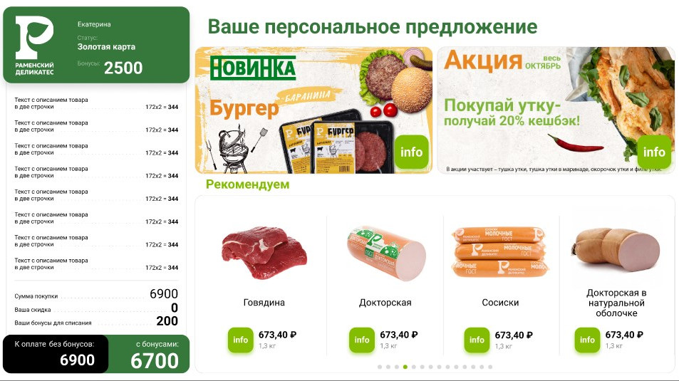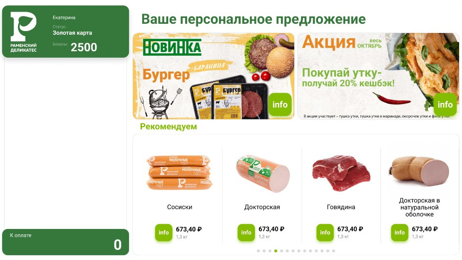 В 2022-2023 году основной целью было сделать офлайн-магазины более современными, цифровыми и персонализированными, так как 99 % продаж происходят в офлайне, а на сайт и мобильное приложение приходится 1 %. Магазины «Раменского деликатеса» прилавочного типа, с работающими за ними кассирами. И из-за этого возникла проблема — кассир не мог знать историю покупок и предпочтения всех посетителей. Чаще всего он допродавал не интересные клиенту товары, а те, которые выгодны ему самому с финансовой точки зрения — например, чтобы закрыть смену, получить премию и т.д. Чтобы решить эту проблему и автоматизировать процесс допродажи, «Раменский деликатес» в качестве эксперимента установил 5 прикассовых мониторов, на которых отображались чек и рекомендации. В рекомендациях были только акционные товары, которые не учитывали историю покупок и интересы пользователя. Также было сложно посчитать их эффективность — товары по акции продавались, но было непонятно — это заслуга прикассовых мониторов или кассиров. Чтобы сделать розничные магазины более персонализированными и понять, какие результаты приносит такой подход, «Раменский деликатес» обратился в Retail Rocket Group. Чтобы внедрить в офлайн-кассы умные рекомендации от Retail Rocket Group, компания построила сложную экосистему, которая включала в себя интернет-магазин и технологии от 1С и Retail Rocket Group. Это была сложная задача, реализация которой заняла год. Внедрили три алгоритма рекомендаций: 1. Если покупатель авторизовался по карте лояльности, и мы знаем его историю и предпочтения — показываем товары, которые он ранее покупал. Этот алгоритм сделали с учетом особенностей поведения покупателей «Раменского деликатеса», большинство которых, как правило, покупает одни и те же товары. 2. Если покупатель ничего не пробил, не авторизовался, и мы ничего о нем не знаем — показываем популярные товары, которые предпочитает большинство посетителей торговых точек. Например, это может быть говядина, любимая многими докторская колбаса, вареники, пельмени. Алгоритм основывался на гипотезе, что знакомить неизвестного клиента с топовыми позициями наиболее эффективно, чем показывать акционные товары. 3. Когда покупатель начинает пробивать продукты, мы показываем сопутствующие товары. Рекомендации обновляются по мере пополнения корзины, после добавления каждого нового товара. Это помогает посетителям увидеть, что рекомендации «живые», реагируют на их интерес, и что с ними можно взаимодействовать. За три месяца работы пилотной версии магазину удалось определить внутренние метрики, по которым они оценивают результат, собрать статистику, а также понять, на что обратить внимание в случае тех или иных доработок. Одно из важных наблюдений — необходимость поощрять «нецифровых» клиентов больше взаимодействовать с прикассовым монитором.
