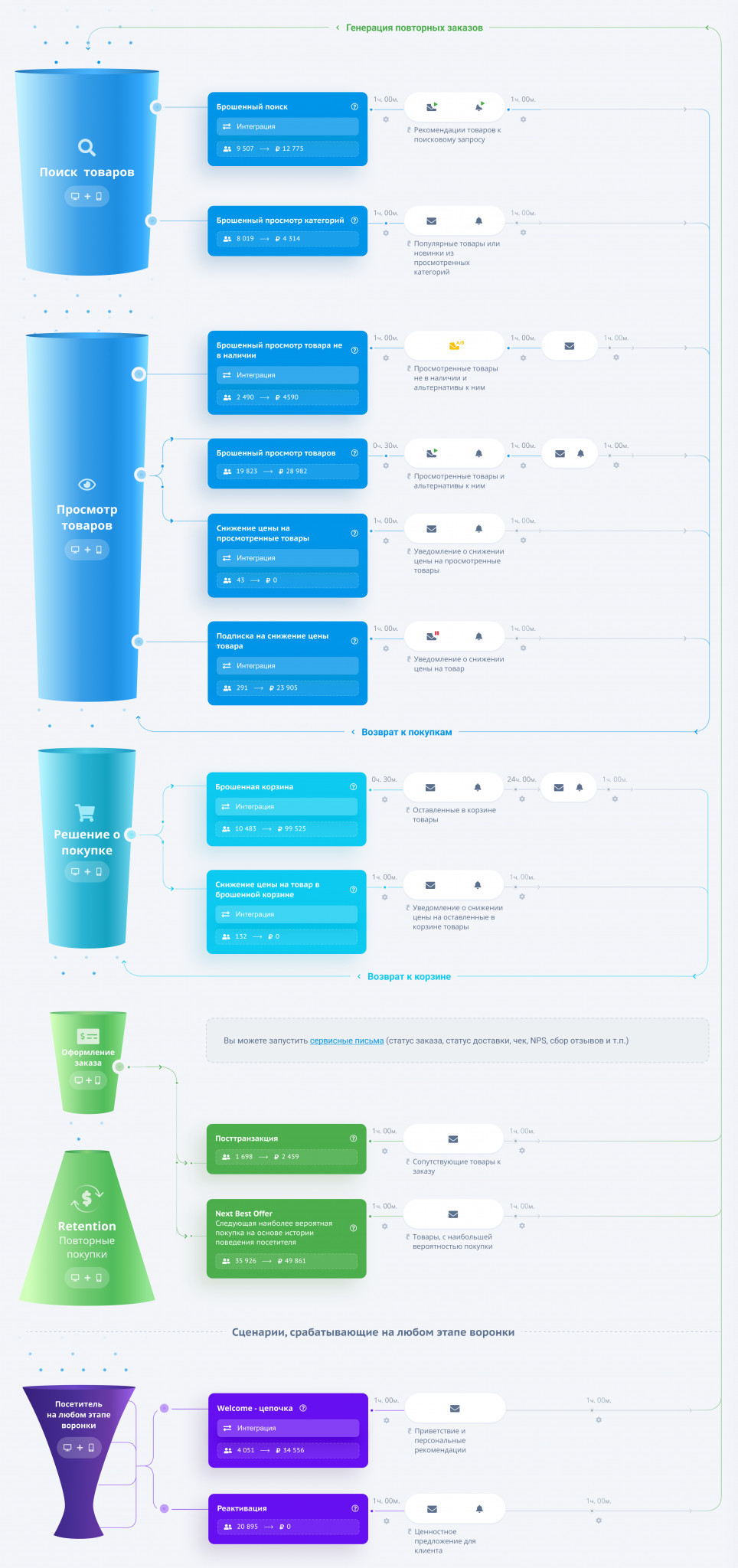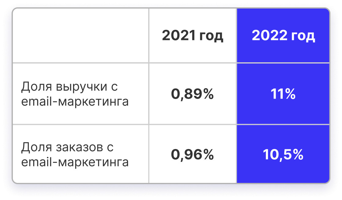 Команда составила для нас карту поведенческих триггеров из 8 базовых сценариев. В 2022 году убрали неэффективные и добавили новые. Сейчас карта выглядит так: Удобно, что карта уже была преднастроена. Не пришлось ничего придумывать и тратить деньги и время на разработку — систему адаптировали под наши задачи за пару дней. Еще понравилось, что сценарии не конфликтуют между собой, покрывают все этапы Customer Journey Map и учитывают поведение на сайте и персональные интересы каждого клиента. За переспам мы тоже не волнуемся — если пользователю подходит несколько триггеров, система автоматически выбирает и отправляет тот, который вероятнее всего приведет к конверсии. Плюс, у нас настроена дополнительная защита от переспама, и пользователи получают максимум три триггерных письма в неделю. Все это помогает держать Spam Rate и Unsubscribe Rate на хорошем для e-commerce уровне — SR до 0,2% и UR до 1%. В 2022 году мы сменили подрядчика по массовым рассылкам — у предыдущего не было удобного инструмента сегментации, и рассылки отправлялись просто на всю базу. Выбрали Retail Rocket, так как уже работали по триггерам, плюс, у них был нужный нам сегментатор, позволяющий за несколько минут строить сегменты по десяткам параметров: частота, давность, сумма покупок, «не открыл письмо» или «открыл, но не кликнул». За январь-октябрь 2022 года база подписчиков увеличилась на 40% по сравнению с тем же периодом прошлого года. То есть большинство людей подписываются на рассылки и остаются с нами. Значит, коммуникации выстроены правильно и приносят пользу. Выручка с триггерных рассылок за год выросла на 90%, и в целом email-канал стал генерировать больше заказов и выручки. На результаты повлияло сразу несколько факторов: • Подключение массовых рассылок • Подключение новых конверсионных триггеров: «Подписка на снижение цены в избранном», «Снижение цены в брошенном просмотре» и «Снижение цены в брошенной корзине». По количеству генерируемой выручки и заказов они уступают место только массовым рассылкам, «Брошенному просмотру» и «Брошенной корзине» • Запуск автоматизированного welcome-письма + возможность вручную дослать письмо тем, кому оно не отправилось Retail Rocket помогает анализировать результаты нашей работы, экспериментировать и повышать конверсию email-маркетинга. Мы довольны сотрудничеством и по возможности будем запускать новые каналы. Например, рекомендации на сайте и в мобильном приложении. Еще мы подключили второй домен, который работает на ОАЭ и Европу, там тоже будут массовые и триггерные рассылки сервиса.