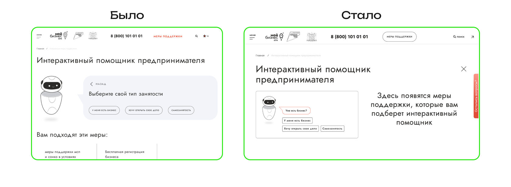 Вот так выглядел интерактивный помощник до тестирования. Не было кнопки, которая бы в один клик перекидывала на страницу мер поддержки. Чтобы выйти из интерактивного помощника, пользователи нажимали на логотип и возвращались на главную страницу вместо страницы мер поддержки. Путь неудобный и неочевидный.