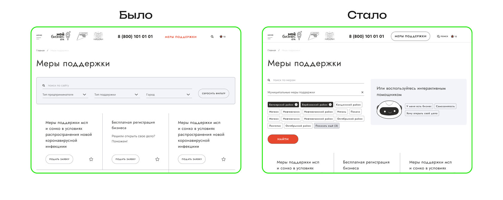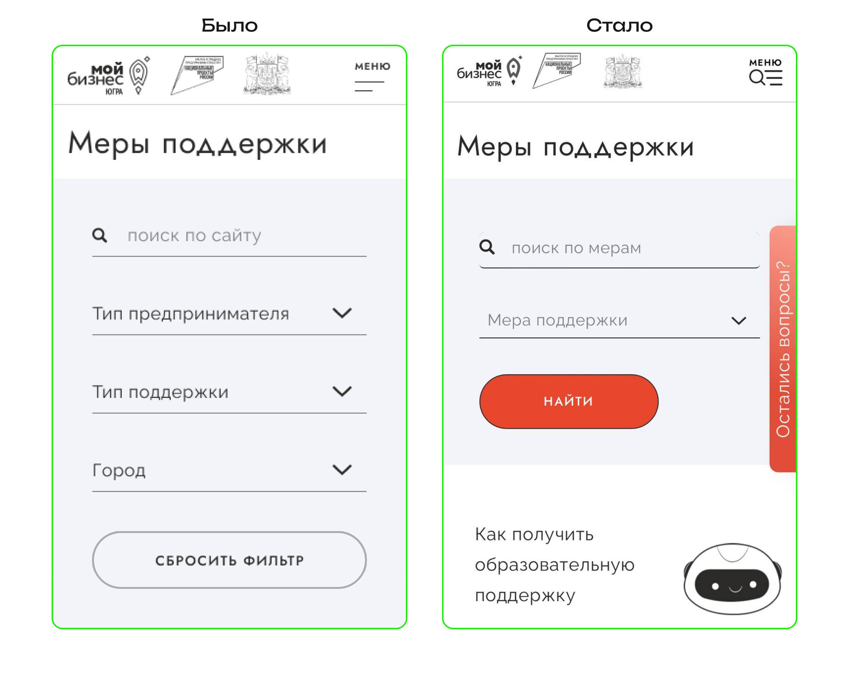 Навигация — тоже всплыла проблема, в том числе из-за слабой мобильной версии, а пользоваться «классическим» порталом со смартфона неудобно. Вот так выглядела главная страница до доработки. Например, кнопка «Меры поддержки» в шапке не выглядела кликабельной и была похожа на заголовок, поэтому многие пользователи ее не замечали. Поисковая строка тоже терялась из-за маленького размера. К тому же оказалось, что одной только картинки в виде лупы — еще недостаточно, чтобы понять функционал. Еще мы узнали, что часть фокус-группы не понимает термины и определения мер господдержки. Получается, например, что до того как найти меры господдержки для «социального бизнеса», предприниматель сначала должен самостоятельно узнать, что же понимается под этим термином. Тут мы как разработчики не можем вносить изменения, но в отчете для заказчика момент терминологии подчеркнули. 1. Перенесли меры поддержки и интерактивного помощника на главный экран, чтобы были видны на любом устройстве 2. В меню дали доступ к общей странице мер поддержки и сделали более очевидным кликабельность заголовка — «Меры поддержки». Дописали слово «поиск» в поисковую строку. Стало понятно, зачем там нарисована лупа. 3. Добавили возможность вернуться к старту помощника в один клик и возможность удалить категории в фильтрах без полного сброса всех параметров. Сделали кнопку «Найти» на странице мер поддержки. 4. Увеличили поля фильтров с категориями, чтобы при скролле прокручивались только они, а не вся страница сайта. Добавили визуальных отличий между фильтрами и интерактивным помощником, чтобы с первого взгляда была видна разница. Все изменения согласовали с заказчиком и его бюджетом. Подготовили макеты, еще раз все согласовали, протестировали на дополнительной площадке и перенесли на сайт. Вот какие метрики изменились после обновления сервиса 1. Динамика просмотров — выросло количество просмотров, это значит, что люди стали пользоваться интерактивным помощником чаще и детальнее в нем разбираться. 2. Динамика посещаемости и активности пользователей — сравнили показатели за один и тот же летний месяц, август 2023 и август 2024: Еще немного примеров «до» и «после» изменений по результатам юзабилити Было Стало С тех пор как мы модернизировали сайт по результатам юзабилити-тестирования, он пережил еще несколько модификаций. Любой, даже самый классный сайт, нужно регулярно тестировать с помощью пользователей и добавлять новые функции, — тогда он всегда будет востребованным, посещаемым и трендовым. У Рецифры большой опыт работы с государственными заказчиками — мы понимаем, как правильно оформлять документы и участвовать в закупках. Можем в рамках одного проекта провести юзабилити и скорректировать сайт, чтобы он стал более удобным, понятным и функциональным.