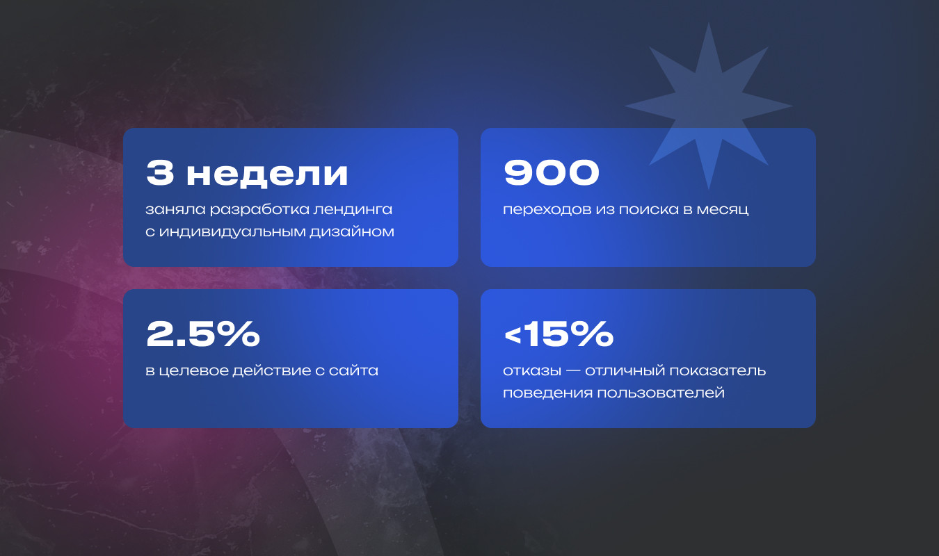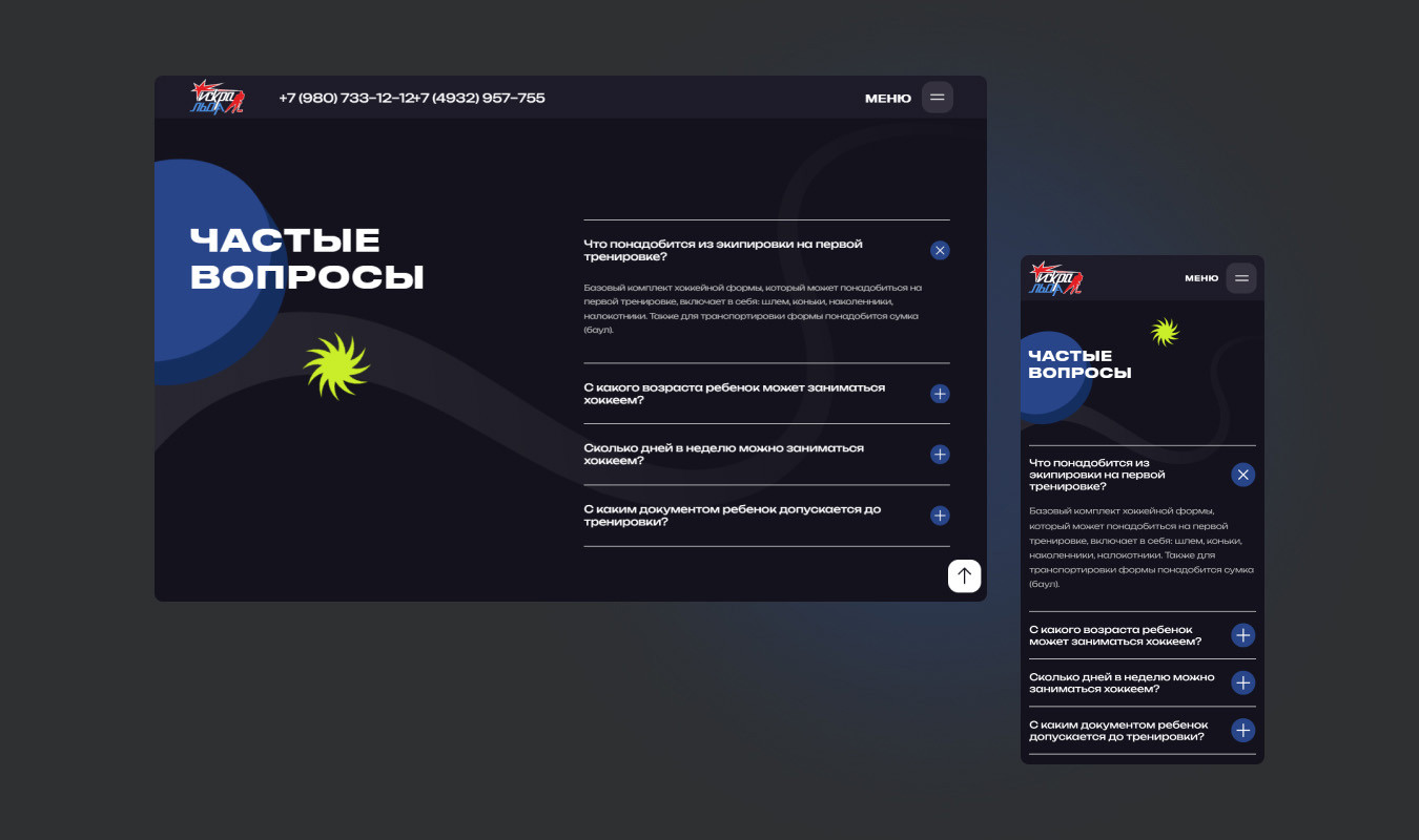 Клиент хотел разработать полноценный сайт, но в ограниченный срок 3 недели, чтобы успеть к открытию центра. Совместно решили, что для быстрого запуска будет достаточно одностраничного лендинга, при этом акцент сделаем на дизайне и скорости реализации. В качестве платформы для разработки выбрали Tilda. На первом этапе проработали структуру лендинга и тексты. Разработали дизайн-макеты для наглядного понимания будущего сайта. Первый экран сделали интерактивным — разместили выезжающих детей-хоккеистов, чтобы акцентировать внимание на главной тематике проекта и динамике спорта. Разместили базовую информацию и форму для отправки заявки. Структурировали и разместили на сайте информацию про возможные тарифы и расписание занятий. Для удобства восприятия разбили на вкладки. Совместно с клиентом составили ответы на часто задаваемые вопросы. Услуга и центр — новые, вопросы точно будут, поэтому важно ответить на них непосредственно на сайте. Это повышает доверие пользователей и повышает конверсию с сайта в заявку. Мы разработали элементы фоновой анимации, которая сделала сайт стильным, подвижным и соответствующим тематике проекта — хоккею. 3) Продвижение Сделали базовые SEO-настройки, чтобы сайт хорошо индексировался в поисковых системах: подобрали запросы, прописали мета-теги, оптимизировали тексты. И сразу же после запуска сайт стал индексировать и получать переходы из поиска! За 3 недели мы разработали яркий и динамичный сайт и успели к моменту открытия проекта, чтобы все желающие смогли получить необходимую информацию.