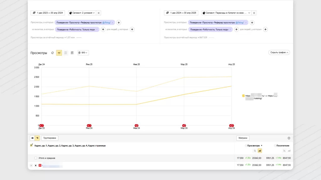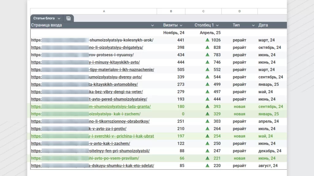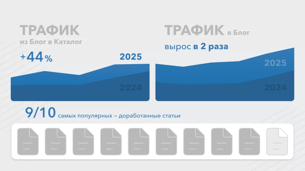 Немного доработали функционал блога: сделали возможность прикреплять к статье товары, которые могут заинтересовать читателя. Продумали метрики, с помощью которых будем анализировать эффективность работы. Остановились на следующих: За годы работы у нас накопилась глубокая компетенция по теме автомобильной шумоизоляции, но при этом в блоге уже были освещены многие популярные вопросы. Тогда мы решили работать по двум направлениям: доработать уже существующие статьи и написать новые. Среди новых тем были такие: Темы, связанные с шумоизоляцией и имеющих спрос, ограничены. Поэтому мы стали писать и на более широкие, но все же интересные целевой аудитории темы: К каждой теме подобрали запросы с помощью сервиса wordstat.yandex.ru. Ведь наша цель — попасть в ответы на эти запросы. Собирали и высокочастотные, и низкочастотные. Использовали LSI-запросы. Для того, чтобы статья показывалась на высоких местах, она должна быть полезной, а для этого важно в том числе и охватить все вопросы темы. Мы анализировали тематику и составляли для каждой статьи план. Мы писали понятные, простым языком написанные тексты, используя нужные ключевые запросы, структурирую по назначенному плану. Чтобы текст нравился аудитории, он должен быть простым и структурированным. Мы подбирали фотографии из базы клиента, использовали фотостоки, создавали изображения с помощью нейросетей, корректировали фото с помощью графических редакторов и при необходимости вручную разрабатывали инфографику. Для удобства восприятия важно структурировать материал: выделить абзацы, подзаголовки, списки, цитаты, ссылки. Чтобы усилить влияние статьи для поисковых систем, а также чтобы читателям было удобно переходить к товарам или другим полезным материалам, в уместных местах мы вставляли ссылки на страницы товаров и другие статьи. Постоянно анализировали результат и вносили изменения в стратегию при необходимости. Практически аналогичные манипуляции мы проводили с уже размещенными статьями, но вместо написания с нуля мы просто дополняли статью дополнительными запросами, материалами, текстами. 1. По сравнению с предыдущим годом трафик в соответствующих месяцах увеличился в 2 раза. 2. Общий трафик в блог в апреле 2025 года составил 20 670 визитов. В начале работы трафик составлял 14 842 визита. 3. Из 10 самых посещаемых статей — 9 переписанных статей. Это объяснимо — страницы уже имеют накопленный авторитет, а мы всего лишь улучшили их, обновили и добавили актуального. И дальше будет лучше! Так как и новые статьи приобретают со временем больший авторитет, внешние ссылки, поведенческие факторы и становятся более значимыми. 4. Количество переходов в Каталог из Блога увеличилось на 44%! Хотите, чтобы ваш блог приносил реальных заказчиков? Нужна помощь в продвижении бренда и расширении узнаваемости через продвижение по информационным запросам? Обращайтесь!