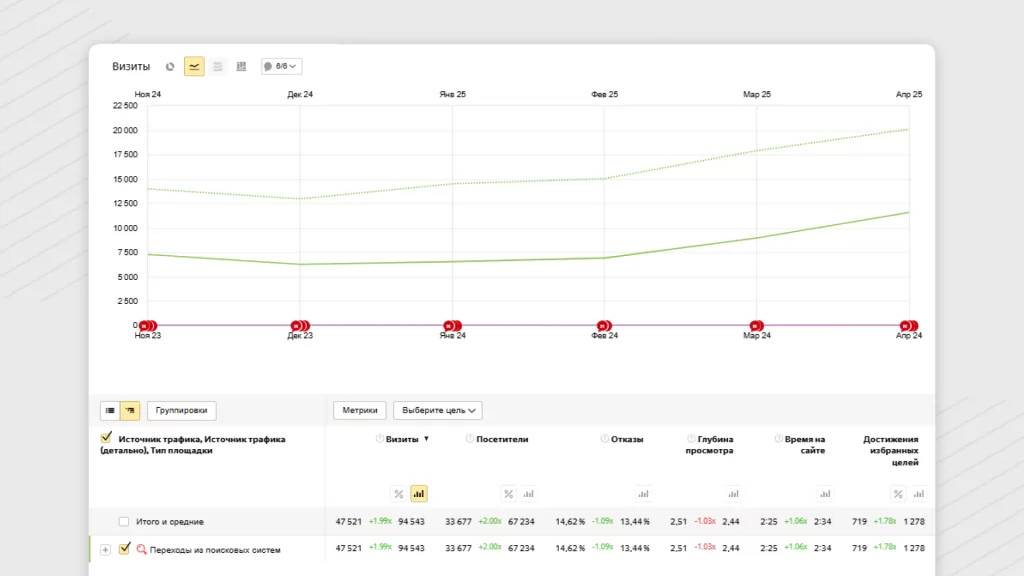 В этом проекте за счёт продвижения по информационным запросам мы достигли хороших результатов: привлекли дополнительных посетителей с коммерческим интересом, увеличили видимость и узнаваемость бренда, усилили уже достигнутые результаты.