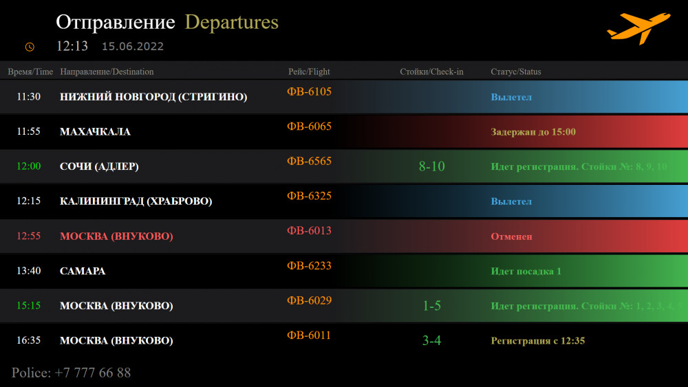 Вывод информации на табло аэропорта осуществляется в автоматическом режиме. Система сама подбирает графические шаблоны в соответствии с установленными ранее правилами. При необходимости сотрудники аэропорта могут самостоятельно добавить любые графические элементы, изменить шрифты и цвета.