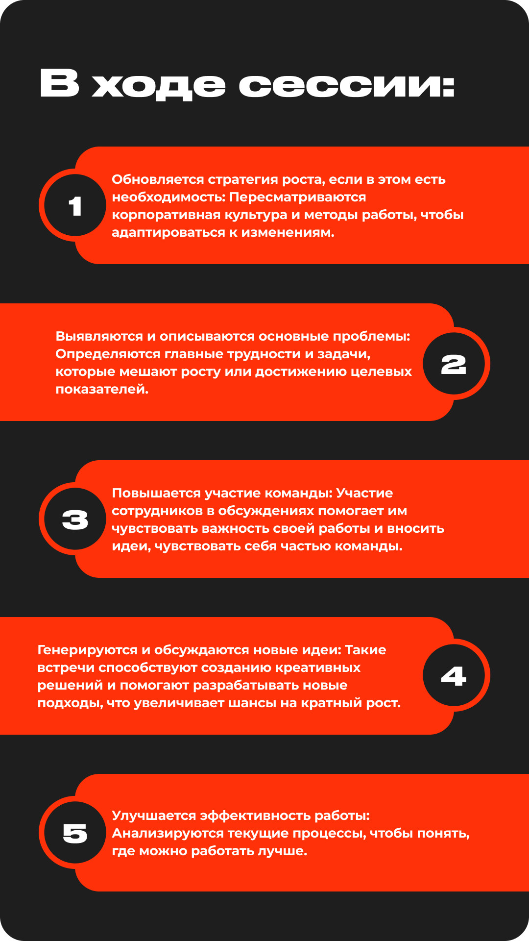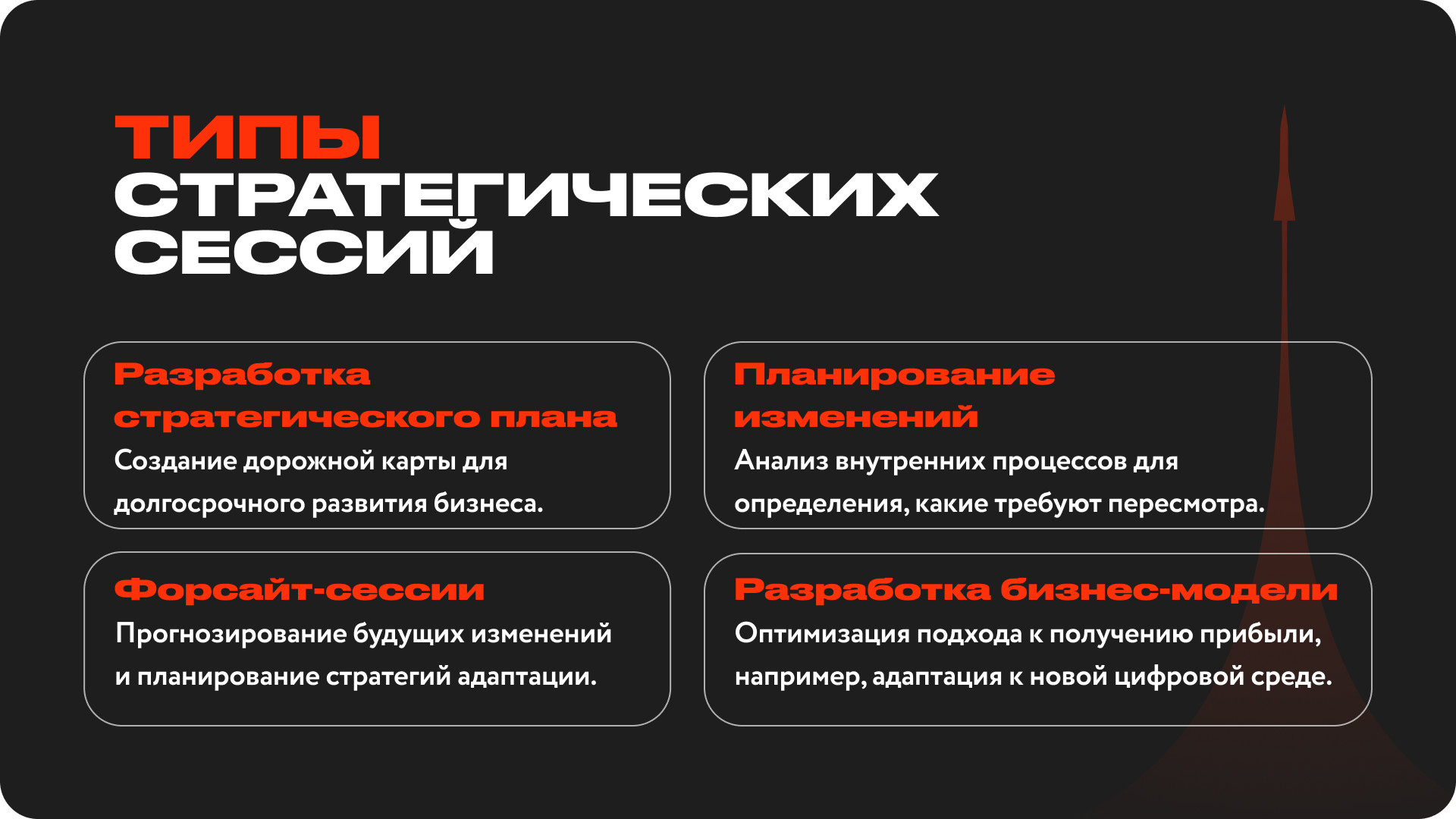 Существует несколько видов стратегических сессий, каждая из которых подходит для решения своих, специфических задач. Мы в ROCKET.red проводим ежеквартальные стратсессии, на которых ставим цели на будущий квартал и обсуждаем результаты прошедшего. А в конце календарного года проводим большую стратегическую сессию, где ставим цели и определяем фокусы на будущий год. Такой подход помогает двигаться к целям step by step и вовремя реагировать на внутренние и внешние изменения. Когда стратегические сессии проводят системно и регулярно, они помогают охватить всю компанию целиком. Этот подход несет в себе множество преимуществ: все сотрудники начинают понимать общее направление, в котором движется компания, быстро выявляются проблемные места, благодаря участию в сессиях развивается креативное мышление и способность искать нестандартные решения, а совместная работа укрепляет командный дух и улучшает атмосферу внутри коллектива. Стратегические сессии уже давно стали неотъемлемой частью развития крупных компаний, таких как X5 Group, Ростелеком, МегаФон, Сбер, Газпром и ROCKET.red. Результаты не заставляют ждать: успешные стратегии позволяют демонстрировать стабильный и значительный рост, даже если годовой план выполнен на 60–70%. Этот факт — неоспоримое доказательство того, что стратегические сессии действительно работают, позволяя компаниям адаптироваться к динамичным условиям рынка и обеспечивать долгосрочное развитие. Стратегическая сессия — мощный инструмент для выработки эффективных решений и адаптации компании к изменениям. Регулярные сессии позволяют бизнесу оставаться гибким и конкурировать на высоком уровне. Это способ оптимизации ресурсов, снижения издержек и повышения удовлетворенности сотрудников, что точно необходимо для системного роста бизнеса.