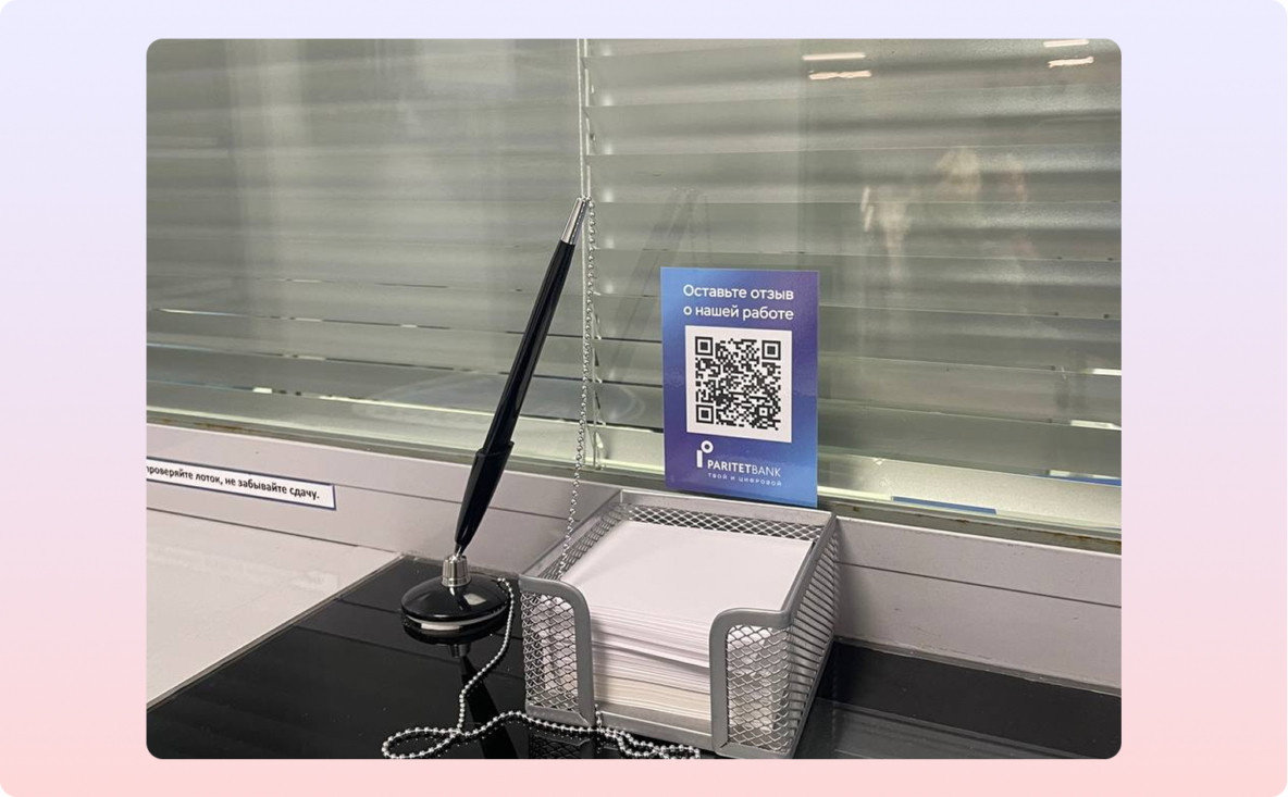 Чтобы мотивировать пользователей участвовать в таких опросах, команда размещает наклейки с QR-кодами в отделениях. Лучшие места для размещения QR-кода по опыту Paritetbank: