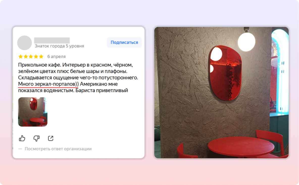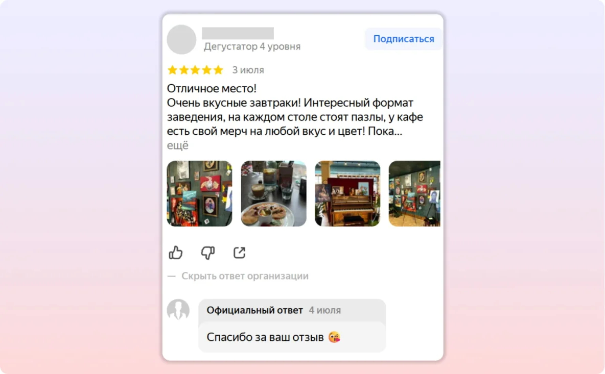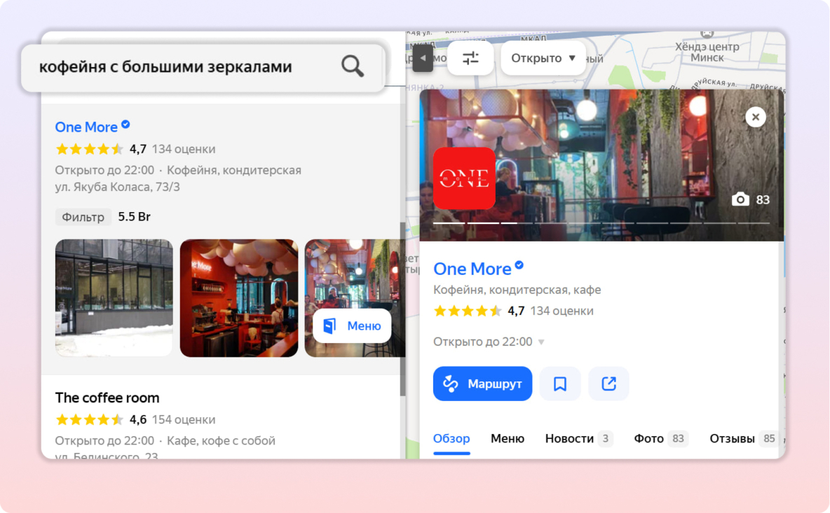 — В Яндекс Картах большое количество отзывов. Пользователи очень любят упоминать то, на чем специализируется то или иное заведение. И если вы сделаете сложный запрос, алгоритмы покажут в выдаче именно ту организацию, где пользователи описывали эту особенность в отзывам, — поясняет специалист. Карточка — «витрина» вашей компании, которая должна демонстрировать не только продукт или услугу, но и другие аспекты, которые могут быть важными для посетителей: стилистика интерьера, наличие летней террасы или возможность зарядить телефон или ноутбук. Добавьте в карточку как можно больше качественных фото и сделайте акцент на мелочах: они могут повлиять на финальный выбор пользователя, который ищет ваш бизнес на картах, в том числе и по сложным запросам. По данным исследования BrightLocal, 96% клиентов готовы написать отзыв о компании, но не все это делают: например, 10% респондентов признались, что считают, что их отзыв не будет иметь значения для других. Напомните клиентам о важности их мнения для вашего бизнеса и других пользователей и обратитесь с просьбой поделиться впечатлениями о том, что особенно понравилось — блюда, музыка, атмосфера или возможность прийти с питомцем. Иногда компании вставляют в ответы ключевые слова в надежде улучшить ранжирование (например: «Спасибо за отзыв! У нас действительно уютная кофейня с десертами и видом на город!»). Но это не работает — алгоритмы учитывают только то, что написали о вашем бизнесе клиенты в отзыве. Меню и прайс-листы помогают найти карточку по сложным запросам, даже, если вы не укажите в меню ключевое слово. Например, если ввести в поиск «Латте на кокосовом», пользователь получит выдачу с кофейнями, где в меню есть кофе с растительным молоком. Алгоритмы Яндекс Карт при формировании выдачи по сложным запросам делает акцент реальный пользовательский опыт. Задача бизнеса — адаптировать карточку под эту систему: работать с отзывами, генерировать больше обратной связи и добавлять в карточку как можно больше информации и качественного фотоконтента.