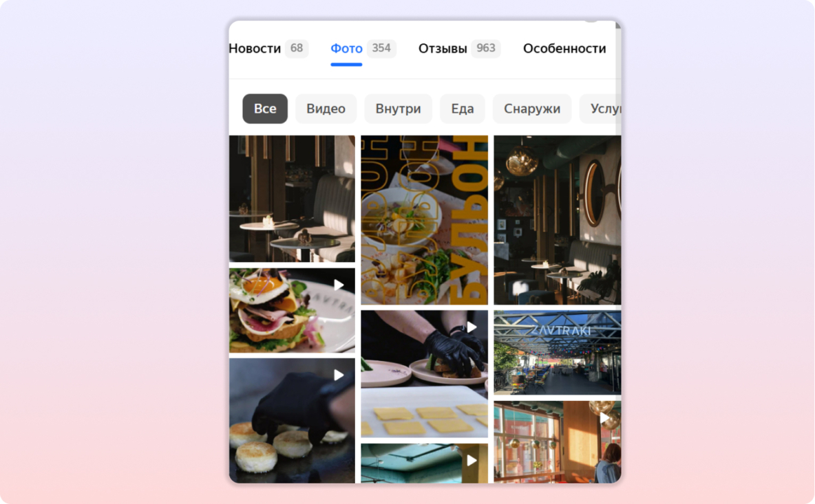 Нейросети анализируют не только описание карточки и ключевые слова от владельцев компаний, но и сайт компании, фотографии, меню, прайс-листы и отзывы пользователей, всю доступную информацию в карточке компании.