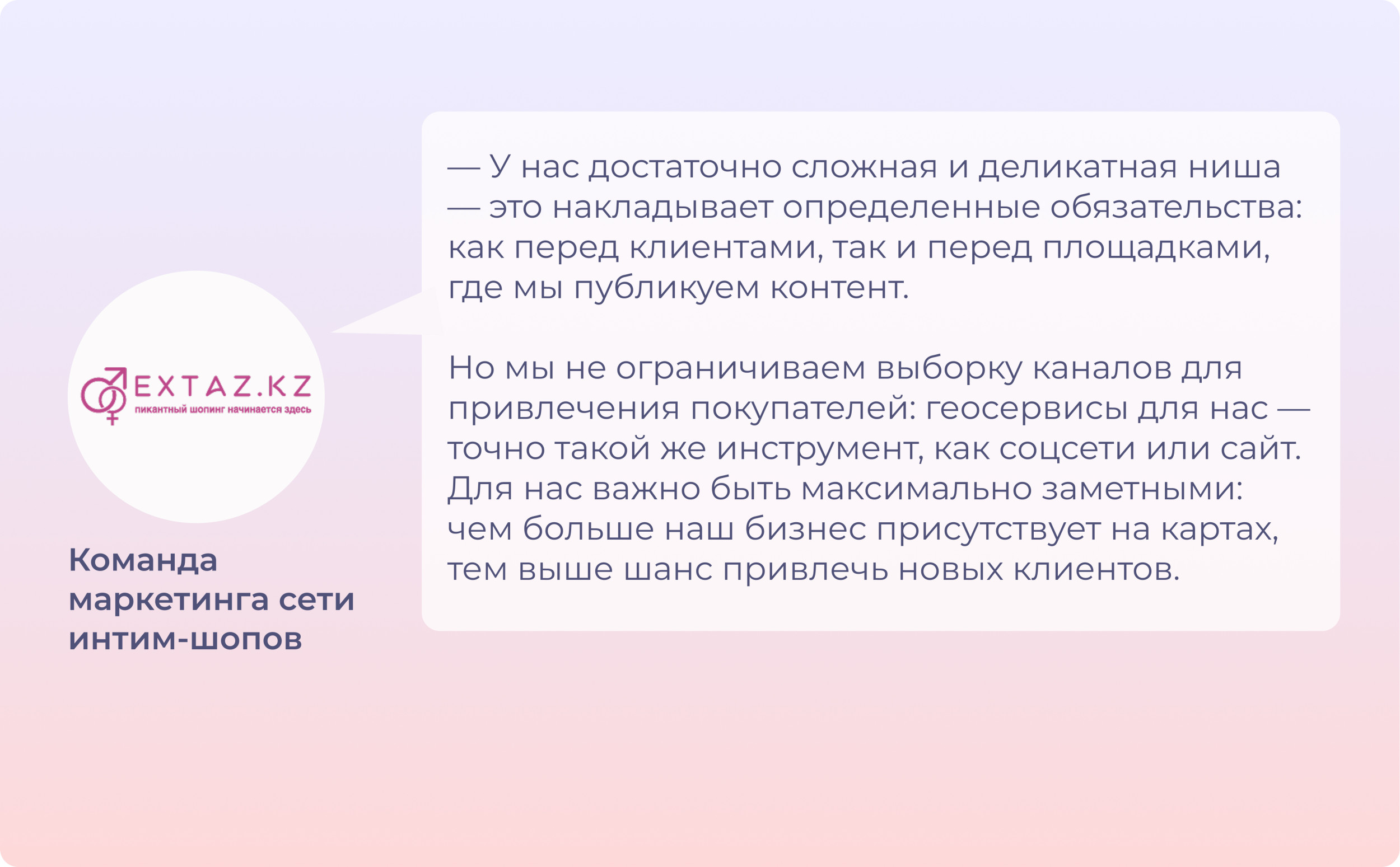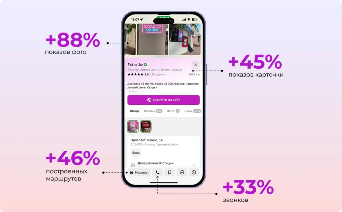 В геосервисах действует ограничение на контент 18+: в 2ГИС и Яндекс Картах запрещено размещать фото товаров для взрослых — их нужно блюрить или вовсе не публиковать. В Google правила еще строже: за неподходящий контент карточку могут скрыть из выдачи, поэтому важно соблюдать баланс между информативностью и требованиями площадок.
