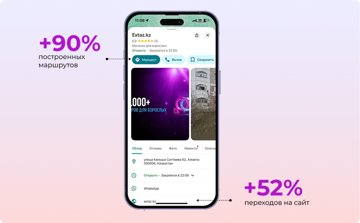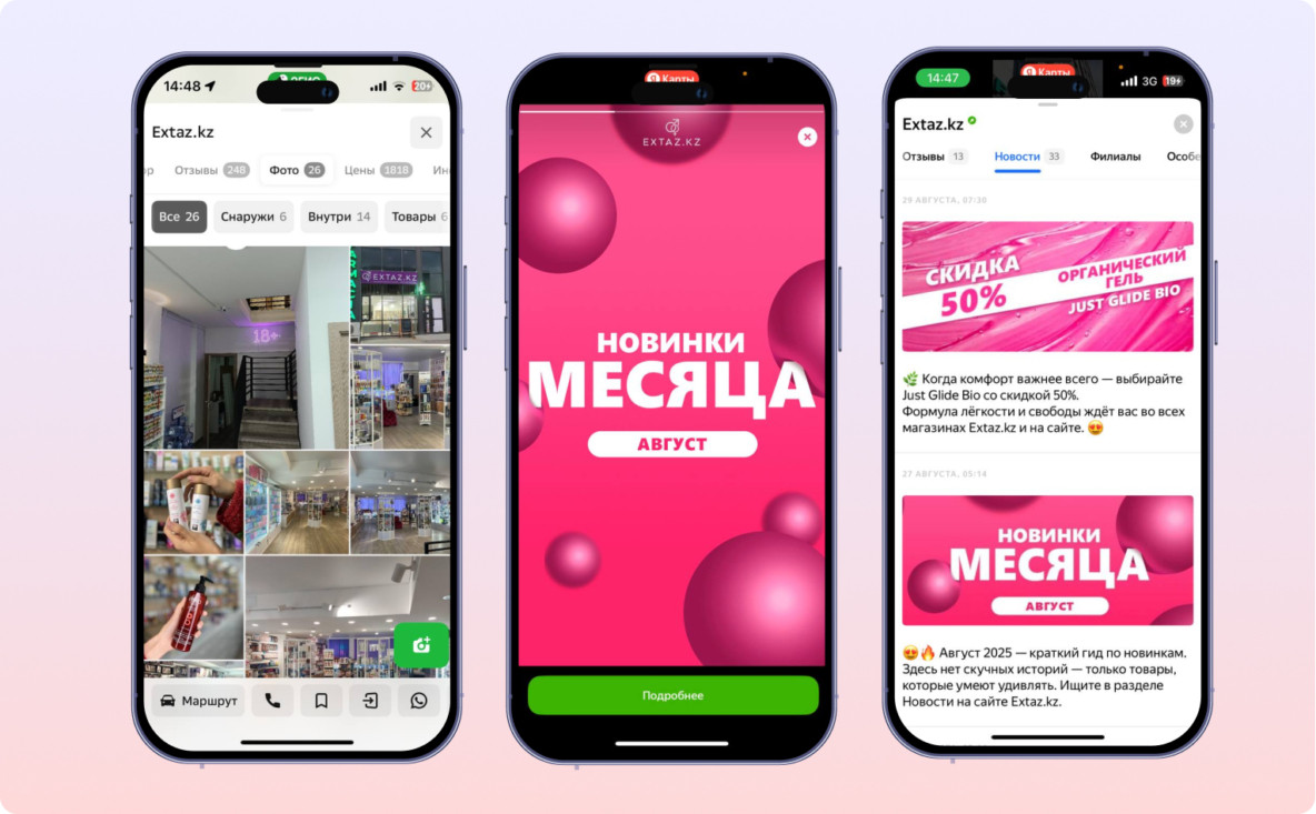Фото, посты и сторис для карточек в геосервисах у Extaz.kz уникальные — контент не дублируется из соцсетей, а адаптируется под требования карт.