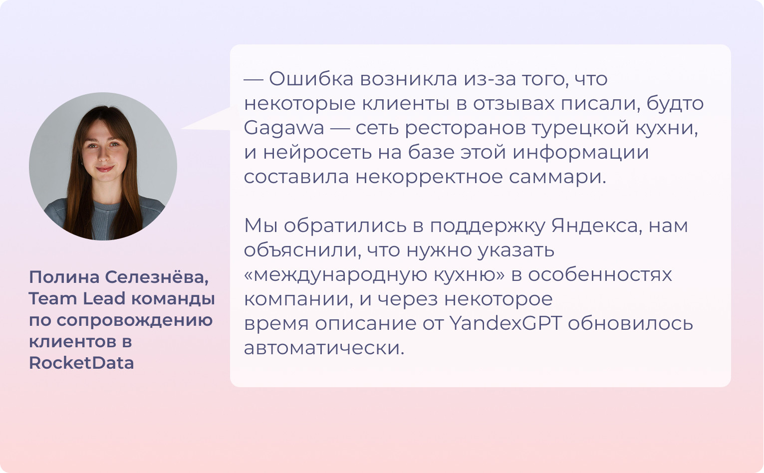 Одна из таких задач касалась некорректного саммари бренда в разделе «Коротко о месте» на Яндекс Картах. Нейросеть YandexGPT указала Gagawa как «ресторан турецкой кухни».