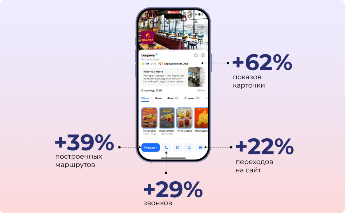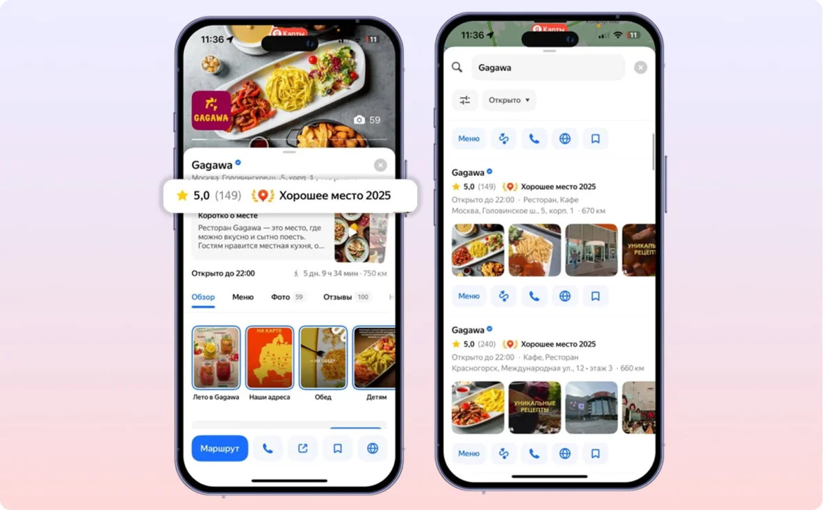— Наши рестораны открывались в Турции, но мы не бренд турецкой кухни. В Турции у нас другое название, а в России, СНГ и на Западе — международное. Из-за этого возникал мислидинг, — объясняет Алина Чекалина. Для бизнеса, особенно в сфере HoReCa, важно быть заметным в локальной выдаче. — Карточки должны быть привлекательными и информативными: с качественными фото, актуальным меню и отражением УТП бренда. Это мотивирует пользователей построить маршрут, позвонить или перейти на сайт, — отмечает Александр Губский, менеджер по работе с ключевыми клиентами RocketData. Контент Gagawa на Яндекс Картах частично дублируется из соцсетей, но адаптируется под формат геосервисов. — Мы добавили описания, выделили УТП — например, детское меню, чтобы рассказать, чем уникален бренд и где найти рестораны. Для этого выбрали сторис и публикации на Яндекс Картах, — говорит координатор по маркетингу Gagawa. — А еще мы заметили, что сторис вовлекают сильнее, чем публикации: они заметнее в карточке и сразу видны пользователям, поэтому наша команда делает на них основной акцент. — Синюю галочку для всех точек мы получили после того, как в карточках появилось меню, описание, были актуализированы все данные. Для нас это стало главным показателем, что мы движемся в правильном направлении. Работа с данными и отзывами через платформу RocketData дала и еще один результат — в 2025 году 7 наших локаций получили отметку "Хорошее место, — рассказывает координатор по маркетингу Gagawa в России. Алина Чекалина отметила, что знак стал для команды приятной неожиданностью. Так, сочетание высокого уровня сервиса и системной работы с картами и отзывами дало бизнесу дополнительный эффект — признание со стороны платформы. Знак «Хорошее место», подчеркнула она, подтверждает качество и усиливает доверие гостей. Работа с контентом и данными на картах ожидаемо повлияла на показы в Яндекс — это значит, что пользователи карт стали чаще видеть карточки сети ресторанов Gagawa в локальной выдаче.