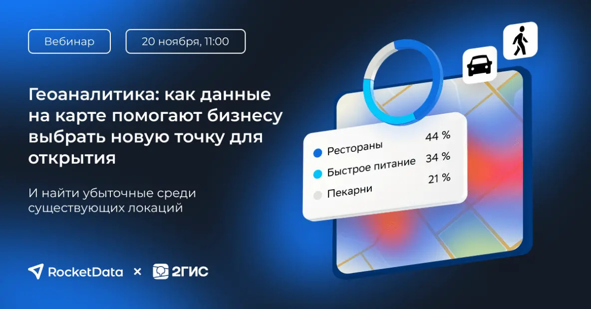 20 ноября RocketData вместе с экспертами из 2ГИС проведет вебинар о геоаналитике: поговорим о том, как использовать этот инструмент для поиска новых перспективных локаций бизнеса и корректировки стратегии действующих точек.
