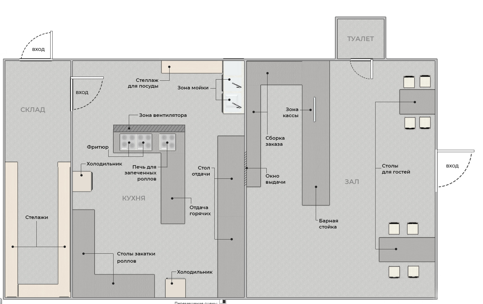Кстати, а вот так выглядит план помещения с расположением кухни, приборов на ней, а также зоны выдачи.
